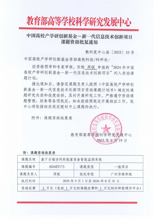 2025近日,由人工智能学院周锐科研团队申报的中国高校产学研创新基金—新一代信息技术创新项目“基于云端协同的起重装备智能监测系统”正式获批立项。该项目由教育部高等学校科学研究发展中心批准立项,是我们首次获批此类基金项目。项目面向新一代信息技术发展趋势,聚焦起重装备在实际工程中的智能化、信息化与系统协同等关键问题,旨在通过校企协同攻关,推动技术创新与成果转化。(信息技术创新项目课题资助批复)此次立项是我...