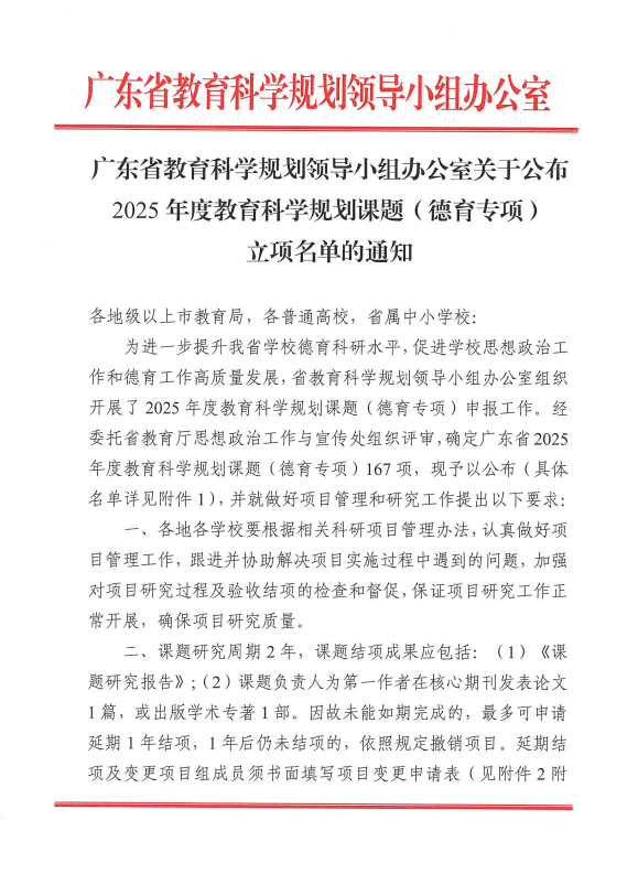 2026近日,广东省教育厅与广东省教育科学规划领导小组办公室相继公布了2025年度相关课题立项名单,广东省教育科学规划(德育)专项立项167项,广东省高校思想政治教育课题立项258项。我们此次申报获批3项课题立项,其中,广东省教育科学规划课题(德育专项)2项、广东省高校思想政治教育课题1项。学生处陈梅副教授主持申报的德育专项课题“同伴排斥对大学生不确定心理压力的影响机制与干预研究”(项目编号:2025JKDY074)聚焦于同...