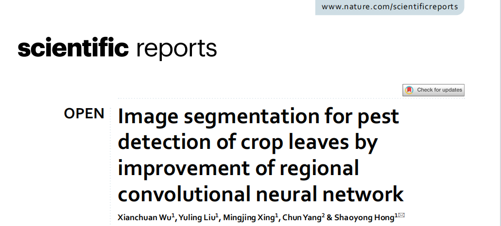 在现代农业生产中,病虫害的早期检测对于保障作物健康和提高产量至关重要。近日,我们洪绍勇副教授领导的研究团队在《Scientific Reports》期刊上发表了一项突破性研究成果,论文的第一作者为吴宪传老师。该论文题为“Image segmentation for pest detection of crop leaves by improvement of regional convolutional neural network”,该期刊属于SCIE检索期刊,是JCR Q1分区,中科院二区。