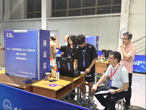 在聚焦商品识别、智能分拣等智能化技术应用的智慧零售赛项(全国共设奖项96项:一等奖19项、二等奖29项、三等奖29项、优秀奖19项)中,华商学子表现尤为亮眼。“睿链智眸”团队(队长:李裕斌,指导老师:杨波),聚焦零售商品目标检测算法优化与机械臂协同控制核心环节。备赛期间,在学校及学院提供的先进设备、充足场地和稳定环境支持下,团队深入钻研,反复测试优化。比赛中,他们凭借扎实的技术功底,精准高效地完成了商品夹取、信息播报等关键任务,其方案的高效性与准确性赢得评委高度认可,最终勇夺全国一等奖!从获奖名单来看,与“睿链智眸”团队一同获得一等奖的还有来自清华大学的“智域行者”、电子科技大学的“i4AI”、中山大学的“sysu 机器人大赛”等多支知名高校团队,这些团队均在各自的研究领域有着深厚的积累,“睿链智眸”团队与他们同台竞技并共享殊荣,更凸显了此次获奖的含金量。