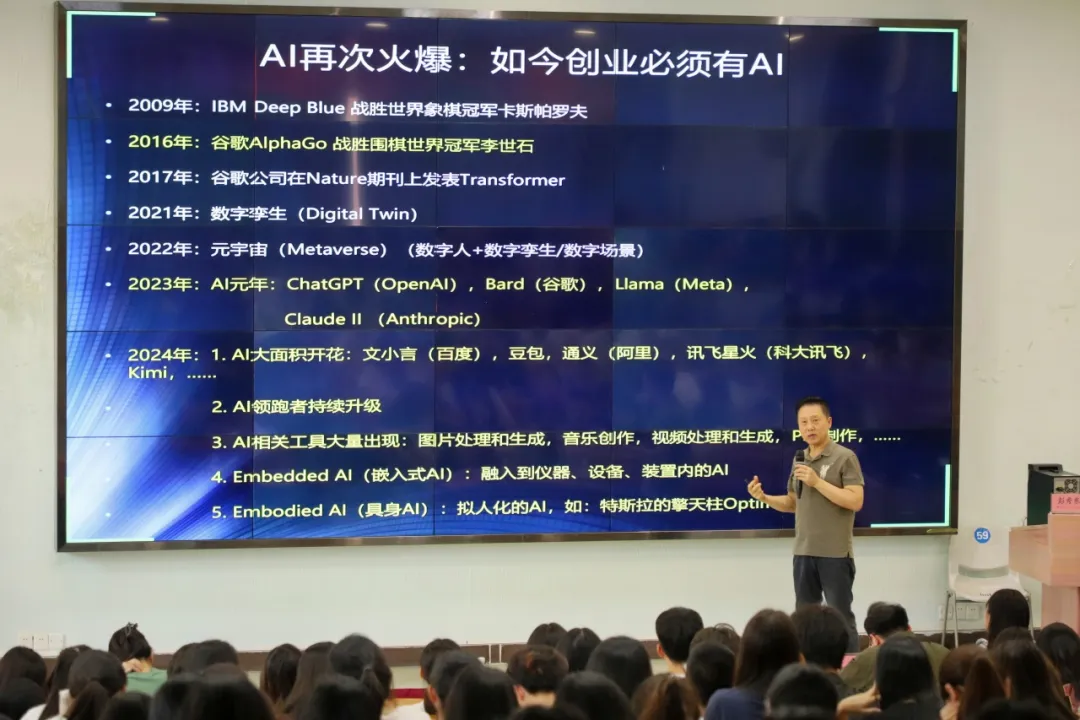 随后,彭教授借助AI技术在生活中的应用实例,提出了“AI再次爆火,如今创业必须要有AI”的观点,并强调创新不仅仅是技术创新,还包括理论创新、产品创新和模式创新。彭教授从市场调研、技术方案、团队建设、融资等多方面为同学们展开分析创业所需的前期准备工作,鼓励在场同学们善于使用AI和数字科技,提升自身的综合素养,以适应未来职业市场的需求。
