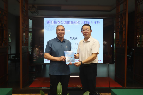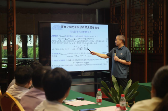 随后,胡庆茂教授作了以“数字图像分割的先验知识挖掘与实践”为题的学术报告。他围绕“先验知识”展开,以通俗的语言和直观的案例梳理了数字图像分割的背景,并介绍了三种分割方法,即基于监督的灰度阈值分割方法、条件随机场图像分割方法以及深度学习图像分割方法。