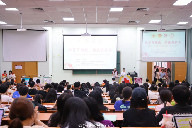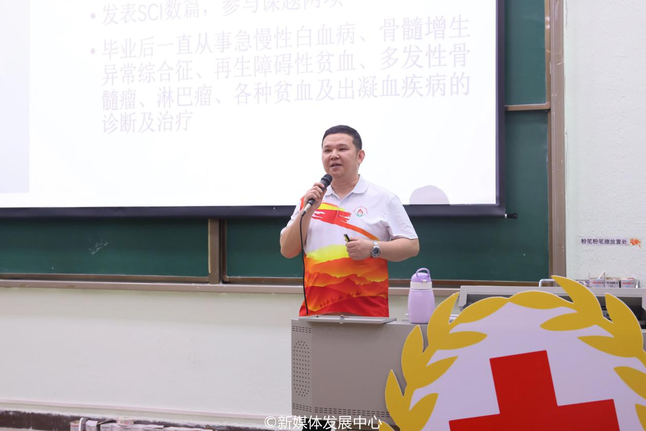 随后,广东省医疗协会血液病分会委员、广东省感染性疾病精准治疗专委员朱朝辉教授为师生们展开地贫知识宣讲授课。朱教授以数据、案例为切入,科普了地中海贫血防控知识。朱教授介绍了地中海贫血的基本知识,包括这种疾病的病因、症状和影响等。在救助方面,朱教授强调了早期诊断和治疗的重要性,通过血液检查和基因检测,可以及时发现地中海贫血患者,并采取相应的治疗措施;在预防方面,朱教授指出,由于地中海贫血是遗传性疾病,因此预防的重点在于减少其发生率。朱教授强调,通过遗传咨询和婚前检查,了解自身及伴侣的基因情况,可以降低后代患病的风险。朱教授的授课内容丰富、深入浅出,使师生们更好地学习到关于应对地中海贫血问题的知识,提高了对地中海贫血的认知和关注程度。