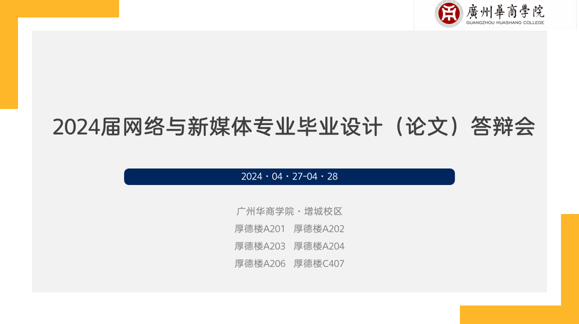 网络与新媒体系历来十分重视本科生毕业设计(论文)工作。为了使2024届本科毕业设计(论文)工作富有特色,近年来,网络与新媒体系领导和教师代表先后前往暨南大学、深圳大学、广州大学、厦门理工学院等网络与新媒体专业国家级一流专业建设点高校参观考察,学习优秀的毕业设计工作经验,借鉴并充分结合新伟德国际1946校情、增城地域特色、网络与新媒体专业学生特点,形成毕业设计(论文)工作方案。选题方面,2024届毕业设计选题采取“指定选题+自选选题”的灵活方式,“指定选题”以增城非遗为选题范围,鼓励学生挖掘具有增城特色的非遗文化,助推增城文化和经济发展。“自选选题”以学生现有实践成果为基础,鼓励学生们将自己大学期间创建与运营的自媒体账号进行优化升级。在认真总结前几届毕业设计(论文)经验的基础上,2024届网络与新媒体专业毕业设计(论文)采取了“毕业设计+论文”的双轨模式,在符合一定规则和条件的前提下,学生根据自身情况进行选择。