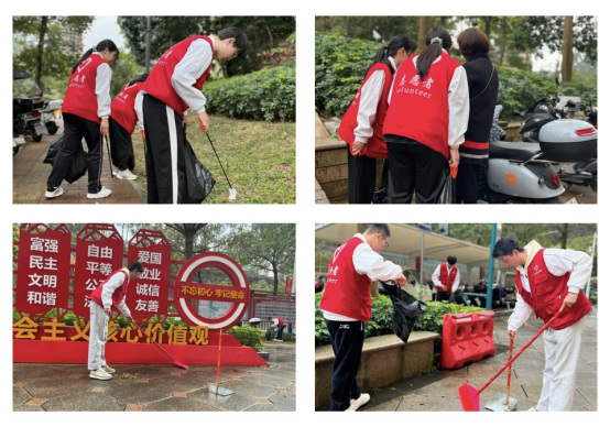 社区清扫——社区文明,实践同行。为提升金竹社区环境面貌,营造良好、舒适、美丽的生活环境,我们团委组织志愿者开展社区文明志愿服务行动。志愿者们清理社区路边落叶、垃圾,维护社区花草树木的健康成长,同时,积极向过往的居民进行保护环境的宣传,号召大家自觉维护社区环境,做好垃圾分类。