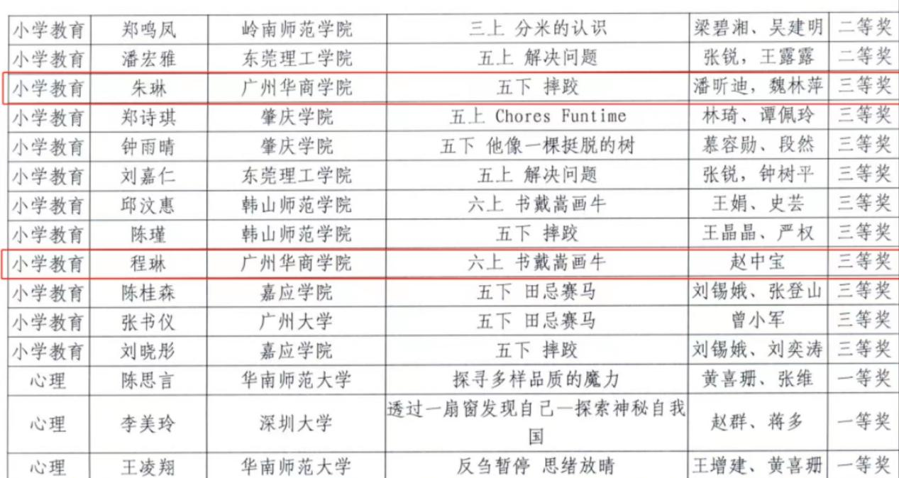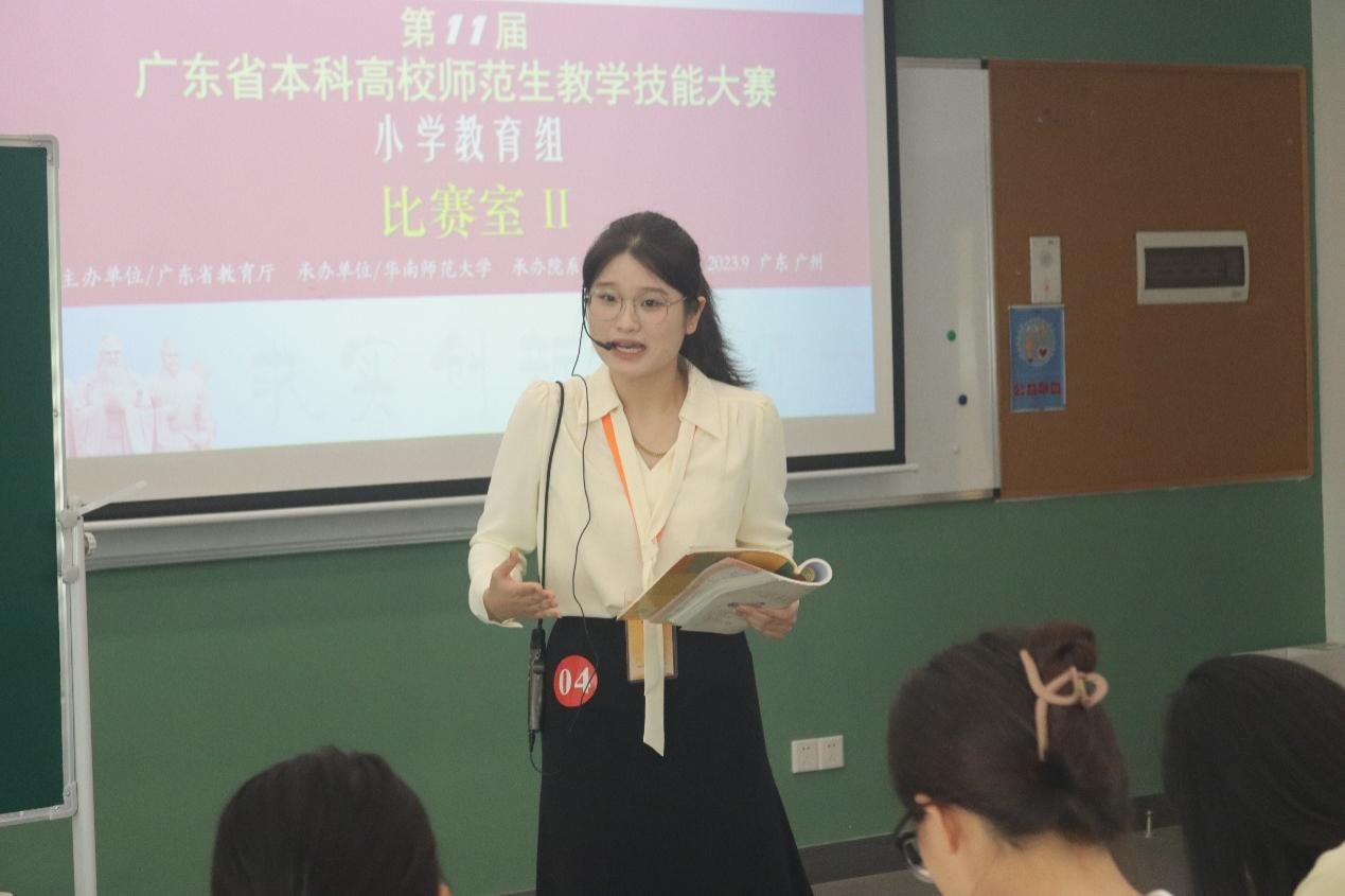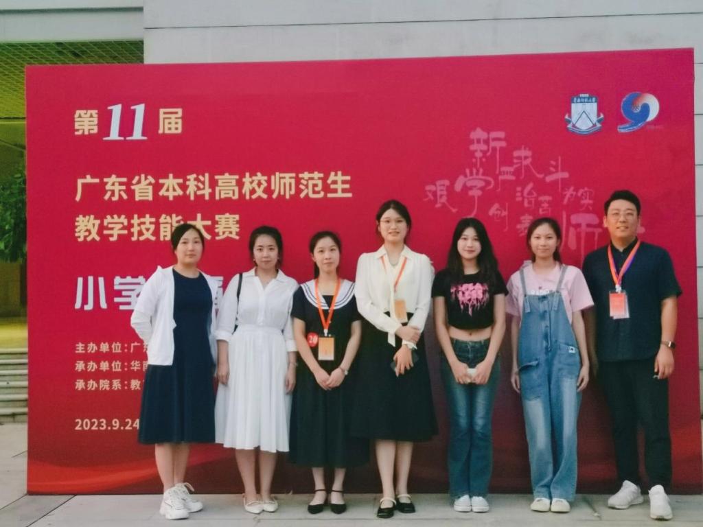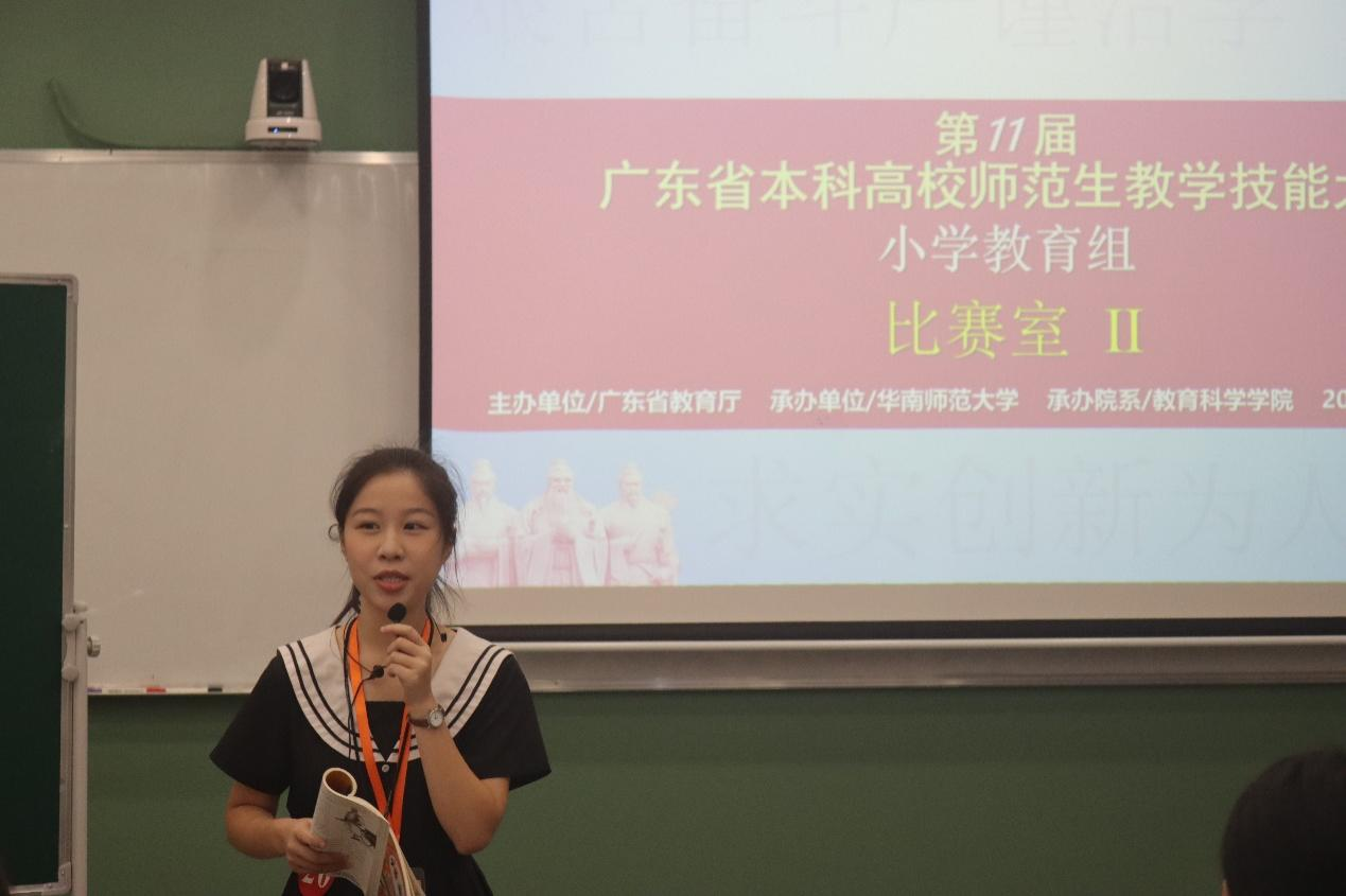 近日,由广东省教育厅主办、华南师范大学承办的第十一届广东省本科高校师范生教学技能大赛(小学教育组)决赛在华南师范大学石牌校区举行。经过校内初赛(2022-2023学年第一学期小学教育专业2021级师范生教师职业能力大赛)推选和省赛组委会初选后,教师教育学院两名参赛选手:朱琳(指导教师:潘昕迪、魏林苹)和程琳(指导教师:赵中宝)代表学校入围决赛圈,并获得三等奖的好成绩。