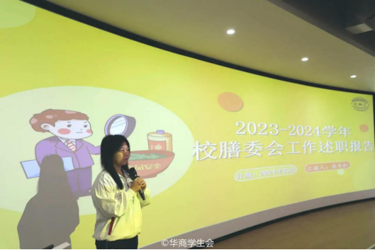 ——膳食管理委员会。膳食管理委员会代表分别从工作回顾、工作不足、思想引领、未来展望四个方面进行述职。为保障师生的饮食安全,膳委会组织工作人员开展周检日检工作,开展“后厨开放日活动”“大众餐评选活动”“第七届安全知识竞赛”等活动,并通过活动普及消费者权益知识,取得较好的反响。在未来的工作中,膳食管理委员会将会根据分校区的情况举办不同的特色活动,增强成员之间的归属感以及团队凝聚力。