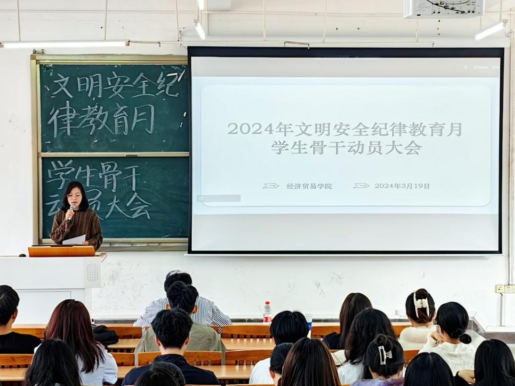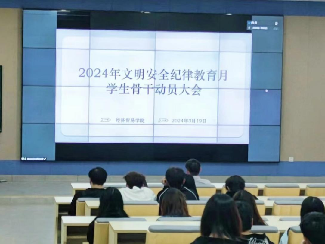 为进一步推进2024年文明安全纪律教育月活动有序开展,提高广大学生的自律守纪意识,规范学生的行为举止,增强纪律观念、安全防范意识,形成良好的校风、学风、班风。经济贸易学院于3月19日下午2:00分别在广州校区励志楼C403、肇庆校区8号楼109召开2024年文明安全纪律教育月学生骨干动员会。