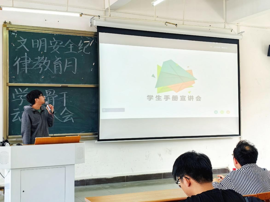 赵敏航同学就《学生手册》纪律主题进行宣讲。赵敏航同学就课堂纪律、考勤管理、纪律处分、宿舍管理进行阐释,提醒同学们宿舍不应出现学校规定的违禁物品,并指出其危险性及影响,强调同学们一学期内旷课累计学时达到不同时段下将予以不同程度的处分,给大家讲解请假的方法及流程。他指出,《学生手册》是每一位同学入学必须展开的教育纪律主题学习,每一位同学都应该严格遵守《学生手册》的各项基本准则,做到严守纪律、严于律己。