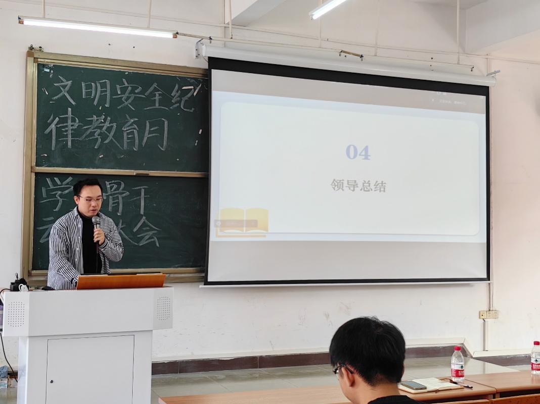 最后,经济贸易学院党委副书记宋元跃老师对本次大会进行总结。他明确文明安全纪律教育月活动的具体目标和任务,表明此次活动是学校加强校园管理、提高学生积极性的一项重要举措。他要求学生骨干做好表率作用、落实好相关工作,组织班内同学进行文明安全纪律学习,提高班级综合素质和安全意识。他希望学生们都能够严格遵守纪律,树立良好的纪律观念,积极响应学校的号召,争做文明安全纪律教育的践行者,让经贸学子真正做到知行合一。