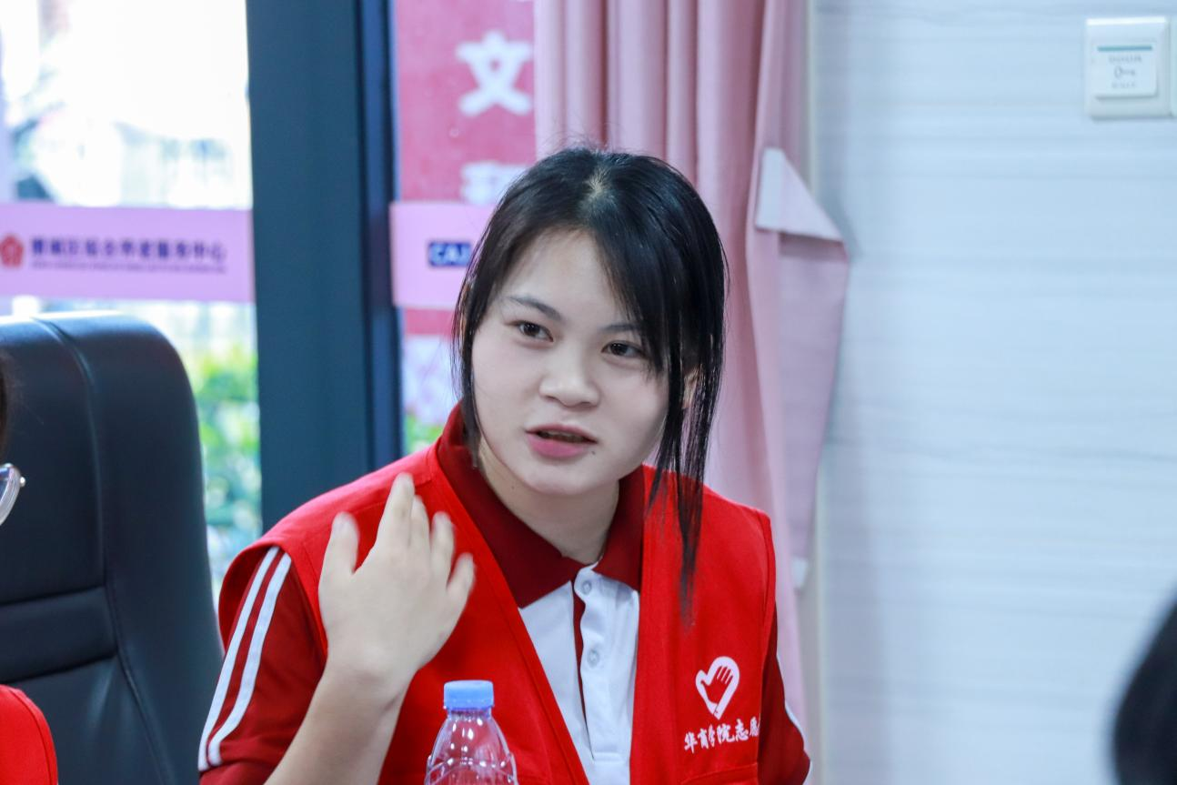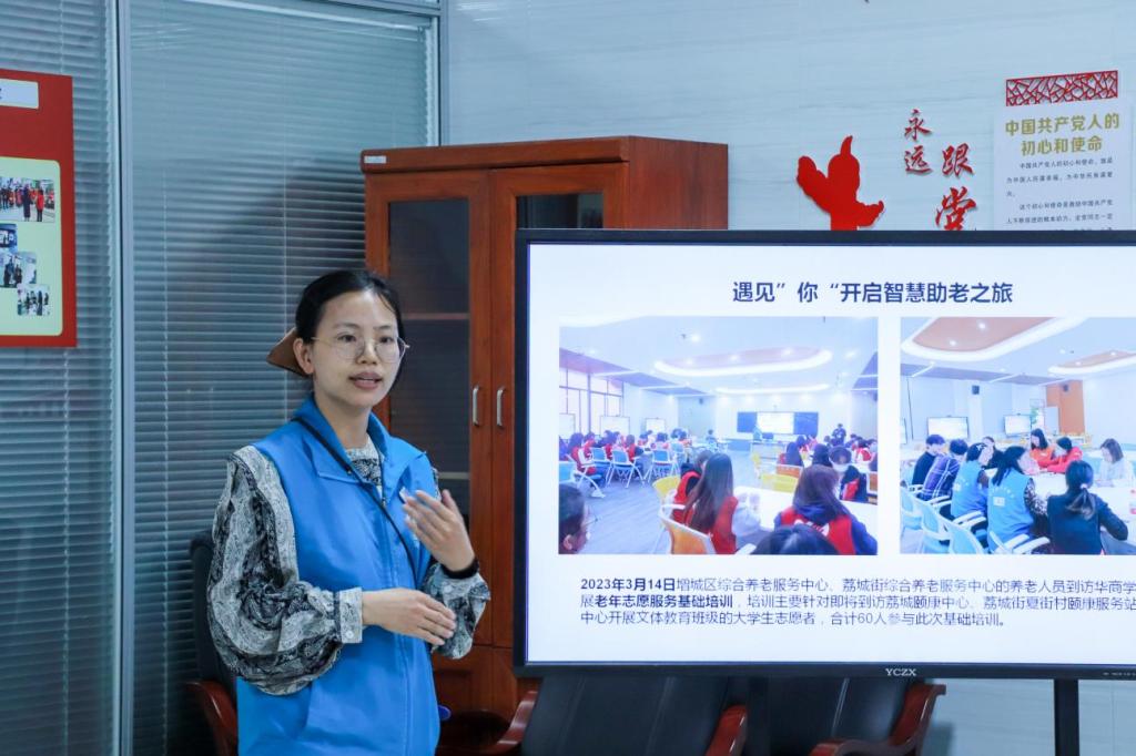 介绍“智慧助老”项目服务情况。广州慈爱嘉养老服务中心葛芳芳主任介绍到,2023年3月至12月,新伟德国际1946“智慧助老”项目开展以来,近200名华商青年志愿者在增城区两个社区参与助老、敬老志愿服务,服务长者500余人,在实践中彰显华商学子的责任担当。活动中,在中心工作人员指导下,华商志愿者采用一对一或集体授课的形式,开展智能手机班、化妆班、中医养生、手工绘画等课程,为社区老人带来新知识、新活力、新体验。