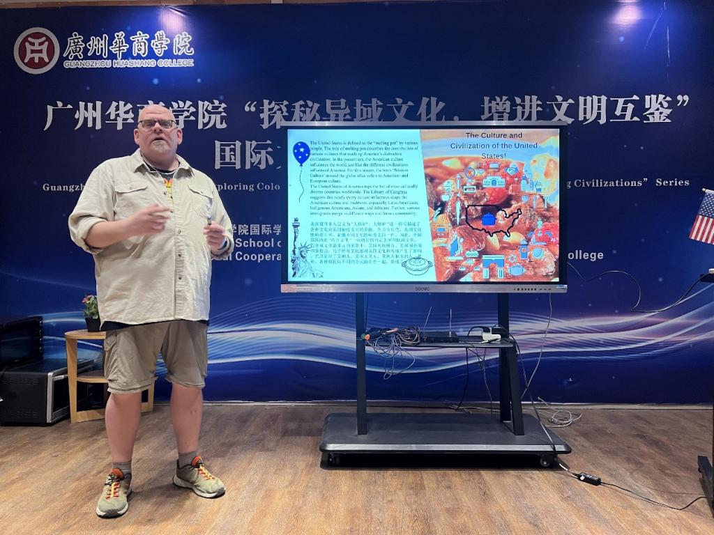 John Jung教授通过PPT介绍了美国的历史、选举制度,并通过对大家心目中的美国刻板印象揭示,如发现美洲大陆第一人、美国牛仔的着装、旧金山淘金潮、印第安人与维京人的关系等,从史实角度展示了真实的美国社会。