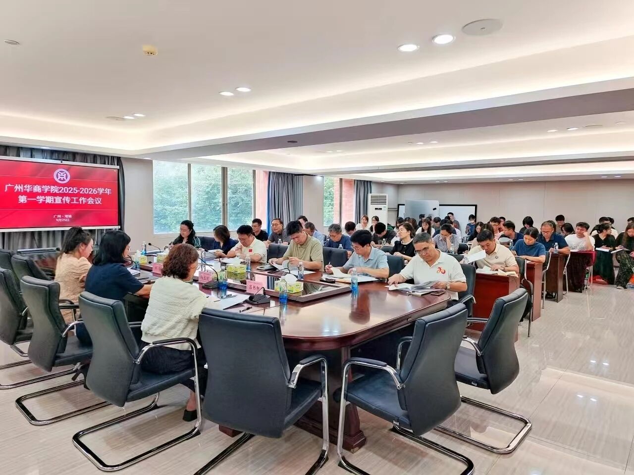 喜迎中华人民共和国成立76周年,做好迎二十周年校庆、迎本科教学工作合格评估,是当前我们宣传思想文化工作战线的“头等大事”。为进一步增强推动宣传思想工作守正创新的责任感和使命感,开创学校高质量发展新局面,着力提升学校宣传思想文化工作水平,守好意识形态安全关口,深化校园精神文明建设,为学校双迎工作营造良好的舆论氛围,9月25日上午,新伟德国际19462025-2026学年第一学期宣传工作会议在广州校区行政楼502会议室召开。学校党委书记陈玉欢出席会议,各职能部门、各二级学院单位宣传负责人、宣传联络员参加会议。会议由党委委员、党委宣传部部长刘苗主持。
