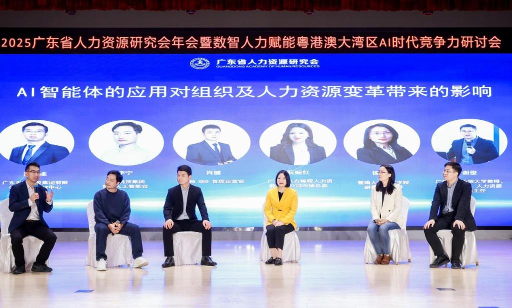 在圆桌论坛环节,广东外语外贸大学谢俊教授、暨南大学经济学院侯雅文副教授,与广东东升控股集团有限公司人力行政中心总经理陈梦雄先生、尊一科技集团首席人工智能官李宁先生、金柚GEO首席运营官肖键先生、广州市八方锦程人力资源有限公司市场总监阮婉红女士等业界精英代表,围绕“AI智能体如何重塑组织形态与工作方式”及“人力资源管理的核心职能如何演进”两大前沿议题展开对话。嘉宾们结合各自实践,就人机协同、组织变革与人才能力重构等关键问题进行了多层次、跨视角的交流与碰撞,为与会者提供了兼具前瞻洞察与实践参考的思想启发。