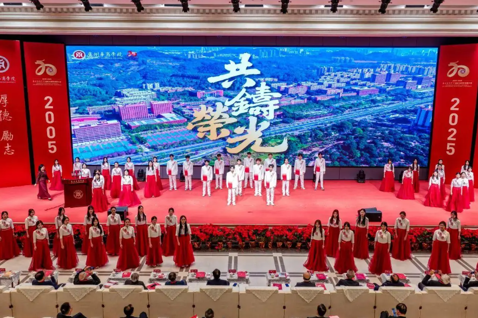 夜幕降临,在广州校区中央图书馆操场上,1000架无人机在空中编队飞行,以《二十正青春 华商向未来》为主题,展现创校之光、立校之魂、育人之基、奋进之路、攀登之梯、美育之果、拥抱之姿、笃行之力、办学之魂等字样与图案,灯光在夜空中勾勒出母校的发展轨迹与美好愿景。当天,由华商师生自编自演的原创大型舞台音乐剧《华商正茂》正式首演。