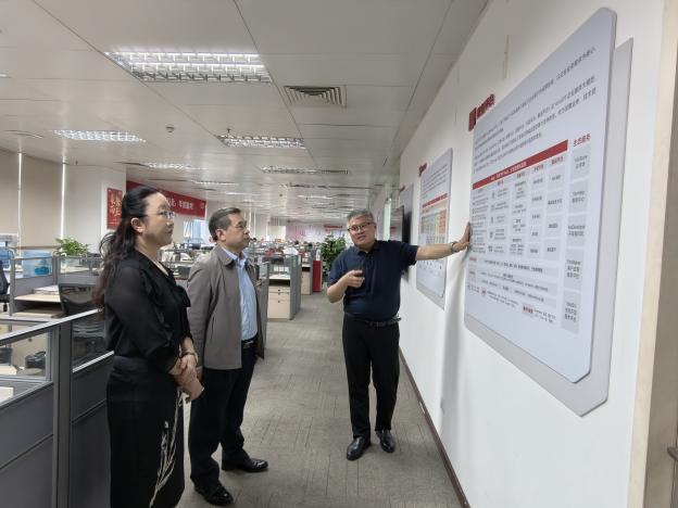 在新道科技股份有限公司广东分公司教育规划总监魏闯的引导下,我们领导一行首先参观了广东用友软件有限公司。魏闯总监介绍,用友曾作为国家牵头项目的中坚力量,在华为遭遇“卡脖子”技术瓶颈时,为其提供核心源代码,助力华为构建MetaERP系统。他指出,企业数字化需经历“业务在线—数据驱动—智能运营”三个发展阶段,目前用友已创设一百多个AI应用场景,并实现从技术到商业价值的有效转化。