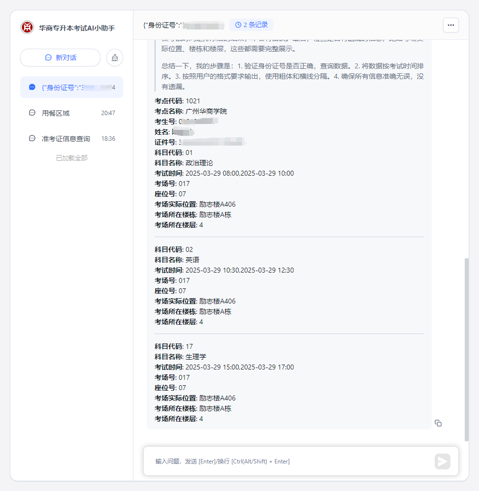 考生可通过华商AI智能体“华商专升本考试AI小助手”(点击阅读原文或跳转链接:https://agent.gdhsc.edu.cn/chat/share?shareId=ytlp005lh8pzf28aoljn02q3)进行考场查询及考点信息搜罗。华商AI智能体通过数字化手段构建考试保障体系,使考生得以系统掌握考点信息,为考生从容应试提供全方位技术支持。