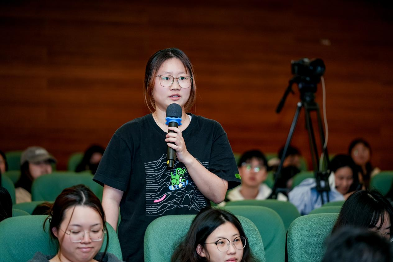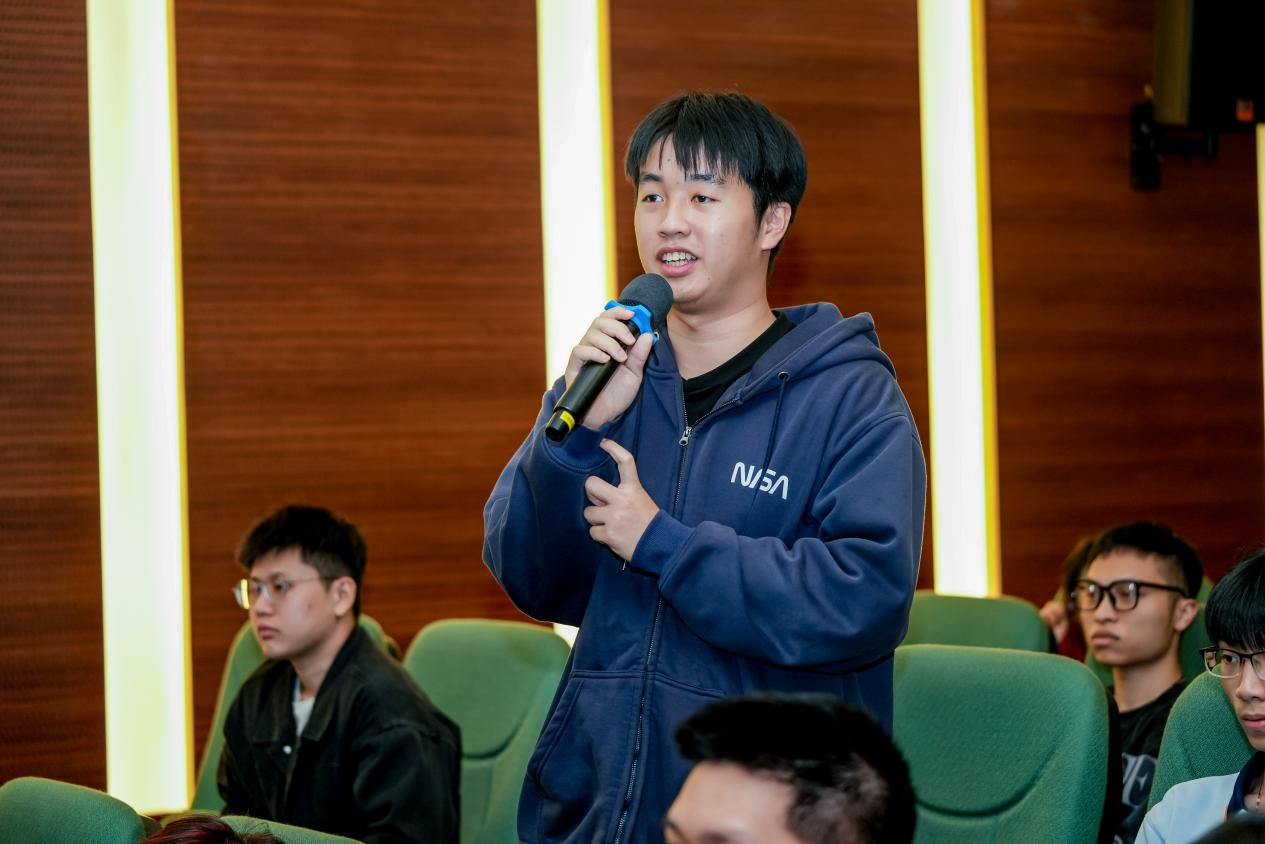 现场学生踊跃提问,“即将毕业,有些迷茫,是选择留在广州发展还是回老家发展呢?”“如何接触AI,开通学习AI的新通道呢?”针对同学们的提问,三位企业家结合自身实践,金句频出,为青年学子指明方向。