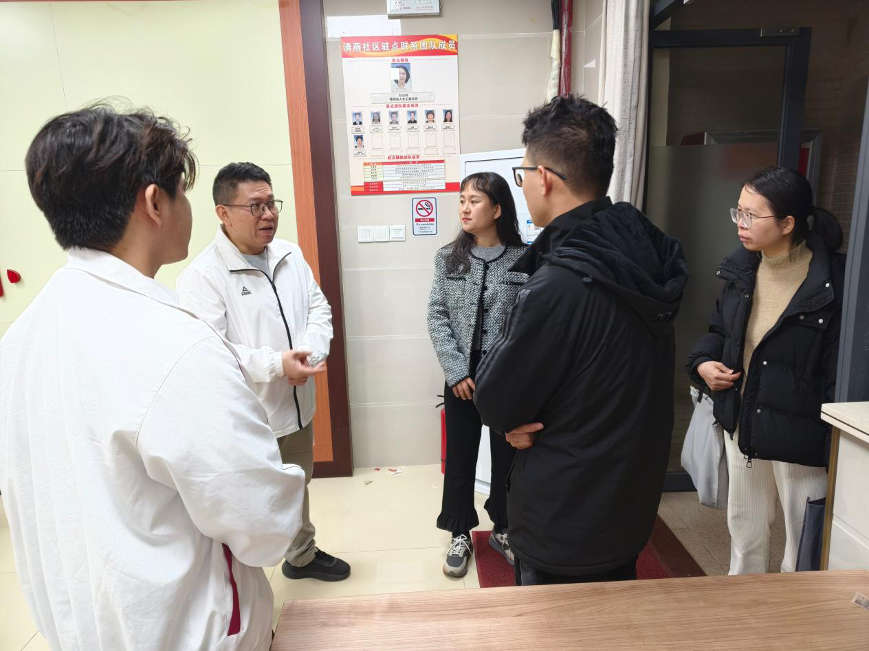 上午,外国语学院副院长何顺发、项目负责人郭宇洁以及辅导员孔翊先一同前往清燕社区进行走访与交流。清燕社区居委会书记邓镜波同志对“晚风学堂”项目的筹备表示欢迎,并介绍了社区青少年的教育现状和课后辅导需求。外国语学院一行实地考察了社区活动场地,包括社区服务站、青少年活动中心等潜在的活动场所,对场地的布局、设施配备以及周边环境进行了全面了解,并就场地的合理利用与社区工作人员进行了深入探讨。