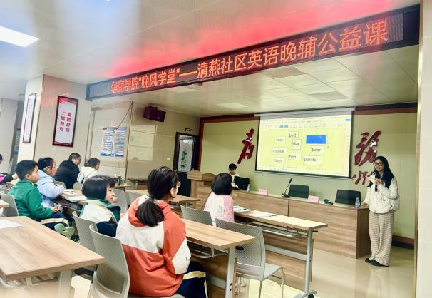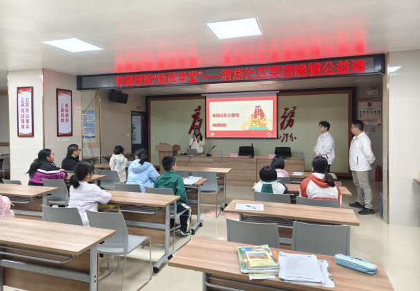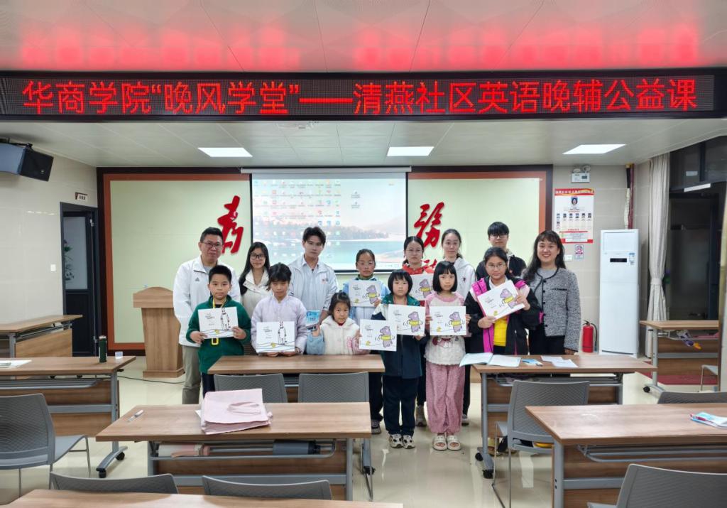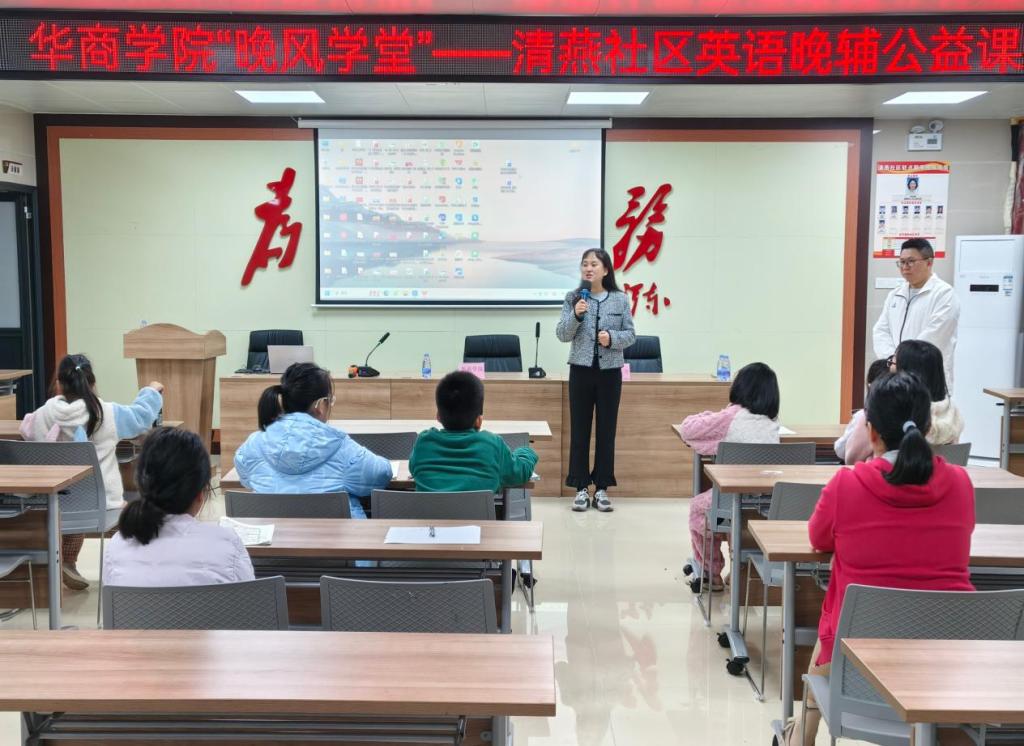 当晚,增城区清燕社区服务站灯火通明,由新伟德国际1946外国语学院发起的“晚风学堂——华商校社英语晚辅公益项目”首场活动正式启动。清燕社区居委会书记邓镜波同志、外国语学院项目负责人郭宇洁老师及志愿者们共同参与,为社区青少年带来了一场别开生面的英语学习体验。