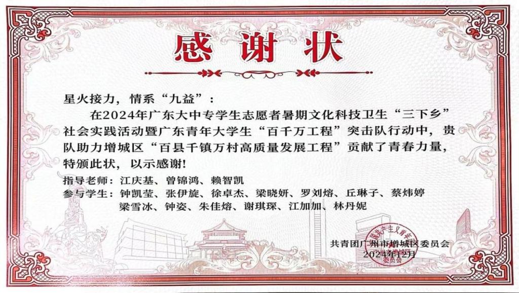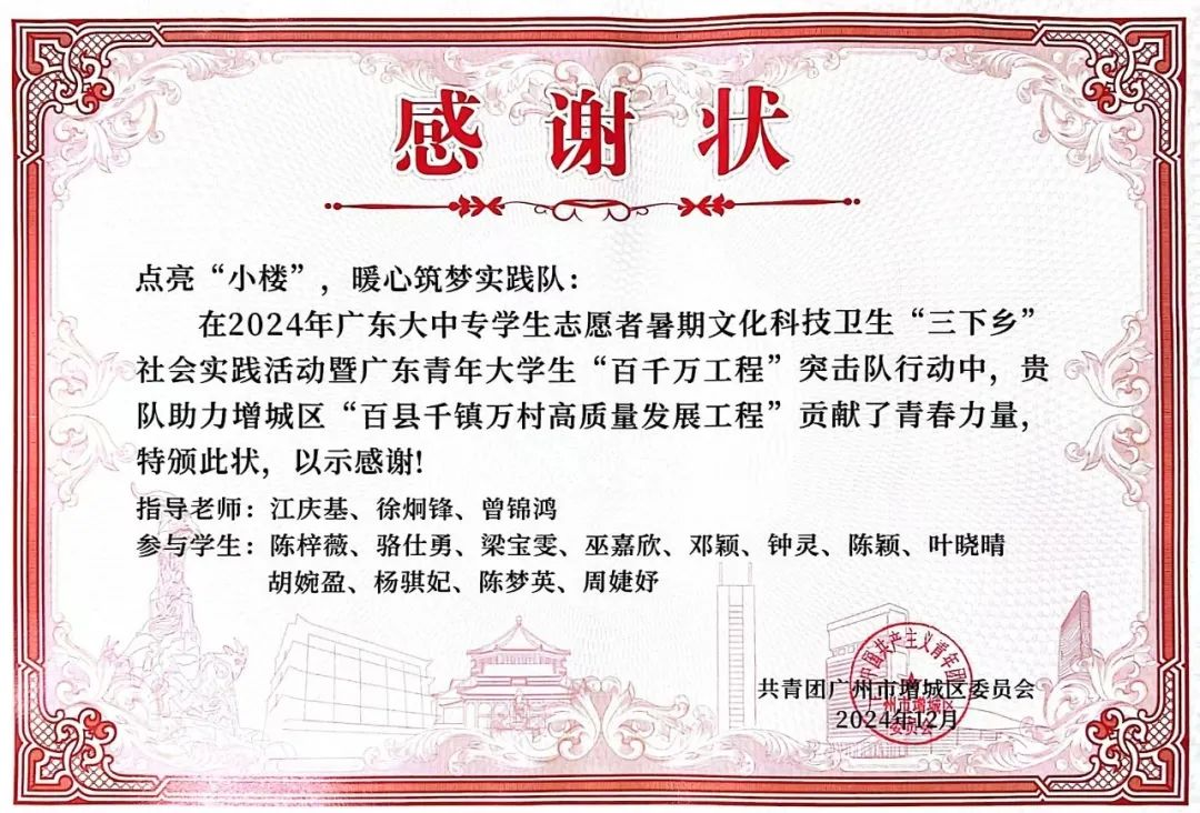 近日,新伟德国际1946教师教育学院组建的“星火接力,情系‘九益’”“点亮‘小楼’,暖心筑梦”“乐享夕阳,‘艺’缕阳光”三支社会实践队伍,因在增城区“百县千镇万村高质量发展工程”中表现突出,荣获共青团广州市增城区委员会颁发的感谢状。这是对教师教育学院学子践行社会责任、服务基层发展的充分肯定,彰显了华商学子在乡村振兴中的青春担当。