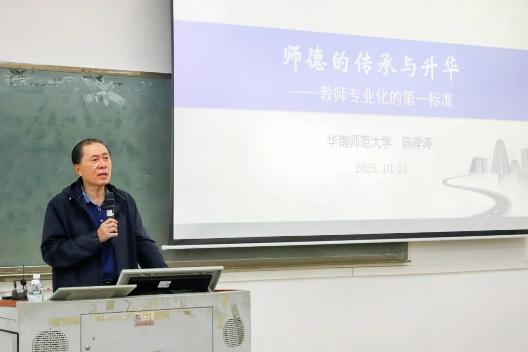随后,华南师范大学陈岸涛教授作“师德的传承与升华——教师专业化的第一标准”专题培训。陈教授深入剖析了当前教师职业面临的机遇与挑战。他结合高等教育普及化、生源结构变化及人工智能快速发展等时代背景指出,随着国家经济社会高质量发展和教育强国战略的深入推进,社会对教师素质提出了更高要求。面对未来可能因师德失范、学历职称不达标、AI应用能力不足等产生的职业风险,教师应增强忧患意识,主动适应变革,将持续学习和自我提升作为职业发展的关键。