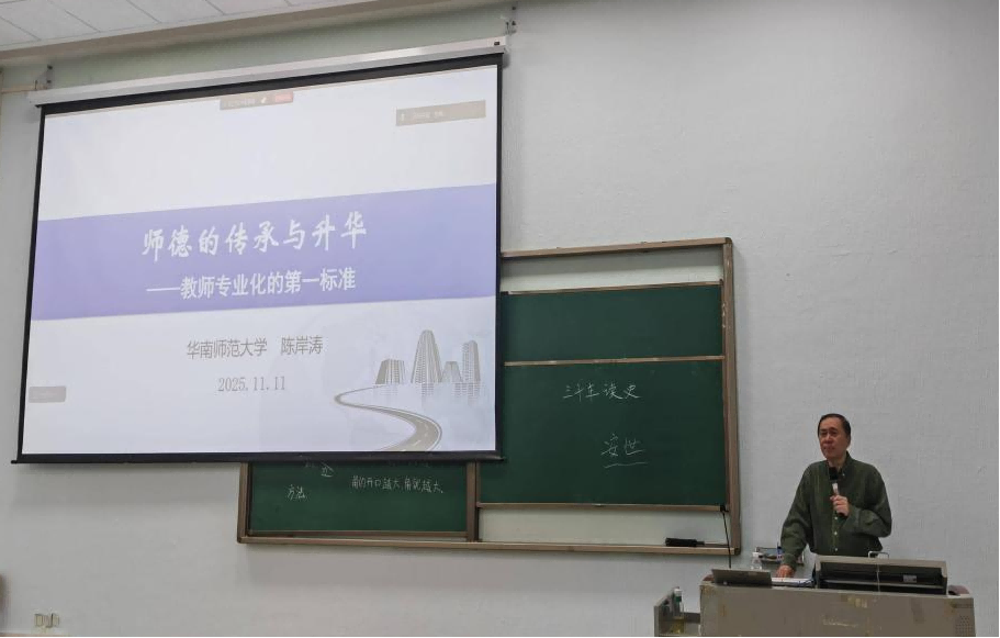 华南师范大学陈岸涛教授以“师德的传承与升华——教师专业化的第一标准”为主题进行培训。他立足国家教育战略,结合时代背景剖析高等教育机遇与挑战,强调“师德是教师评价首要标准”,需贯穿职业发展全程。他通过教育界先进事迹解读“四有”好老师内涵,鼓励教师以学促思、提升素养,强调传承师德并非简单复刻传统,而是要汲取中华优秀传统文化中的教育智慧,将“立德树人”的根本任务融入教育教学全过程,让师德的精神内核代代相传。