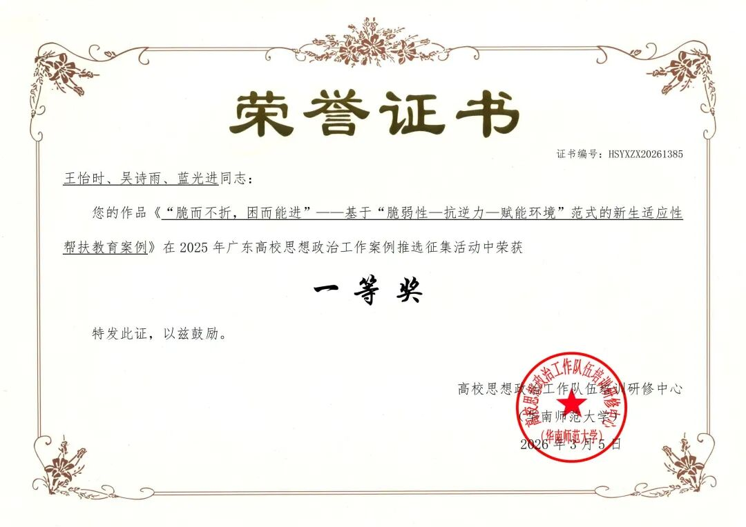 1.王怡时、吴诗雨、蓝光进老师的《“脆而不折,困而能进”——基于“脆弱性—抗逆力—赋能环境”范式的新生适应性帮扶教育案例》荣获2025年广东高校思想政治工作案例一等奖;