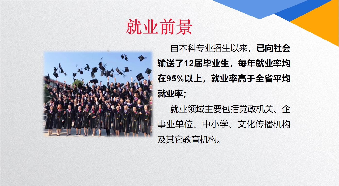 【就业方向】在党政机关、企事业单位及文化传播机构、中小学及其它教育机构从事文秘公关、宣传交流、编辑出版、文化策划、教育教学和培训等工作。