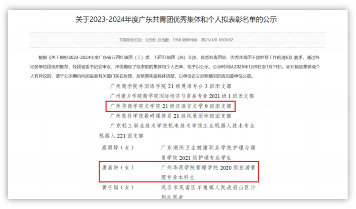 近日 , 共青团广东省委员会发布了2023—2024年度广东省五四红旗团 ( 工) 委 、 五四红旗团(总) 支部 、 优秀共青团员和优秀共青团干部名单,我们伟的国际1946bv官网21级汉语言文学9班团支部荣获“广东省五四红旗团支部”,管理学院优秀校友唐嘉妍荣获“广东省优秀共青团员”。