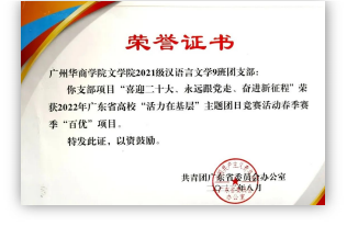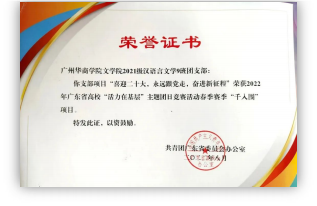 21级汉语言文学9班团支部在思想阵地建设中不断开辟新路径 、 新形式 ,获2022年广东省 高校“活力在基层”主题团日竞赛活动春季赛季“百优”“千入围”项目; 获2022年度优秀团支部等称号。 团支部成员先后获优秀实习生; 5 人获评“学校文明安全纪律教育月先进个人” , 部分成员荣获“优秀共青团干部”“优秀共青团员”“优秀志愿者”等荣誉称号。