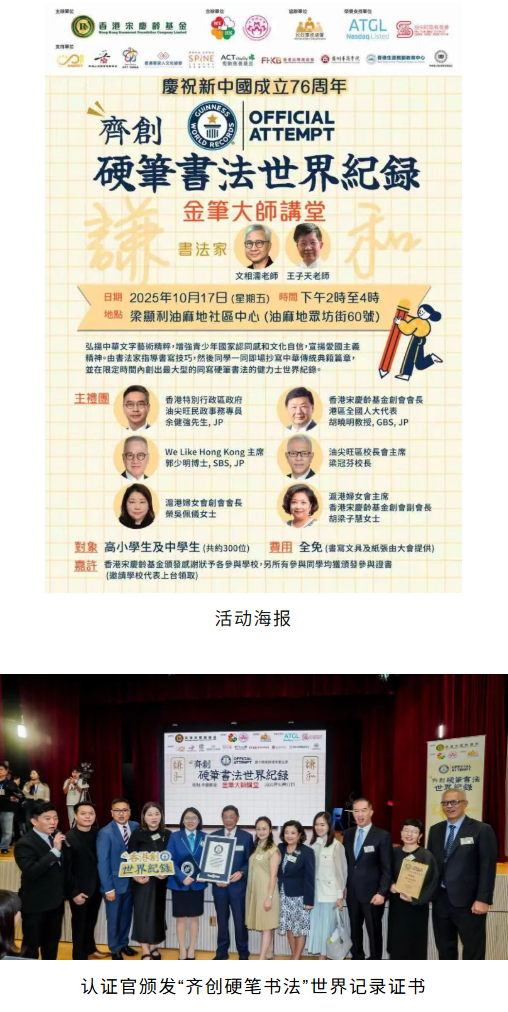 10月17日,香港宋庆龄基金联合多家教育机构,在港举办“齐创硬笔书法世界纪录”活动。近三百名中小学生与教师同堂挥笔,以硬笔书写《论语》《荀子》等中华经典语句。此活动最终以291名有效参与人数,成功打破健力士世界纪录。