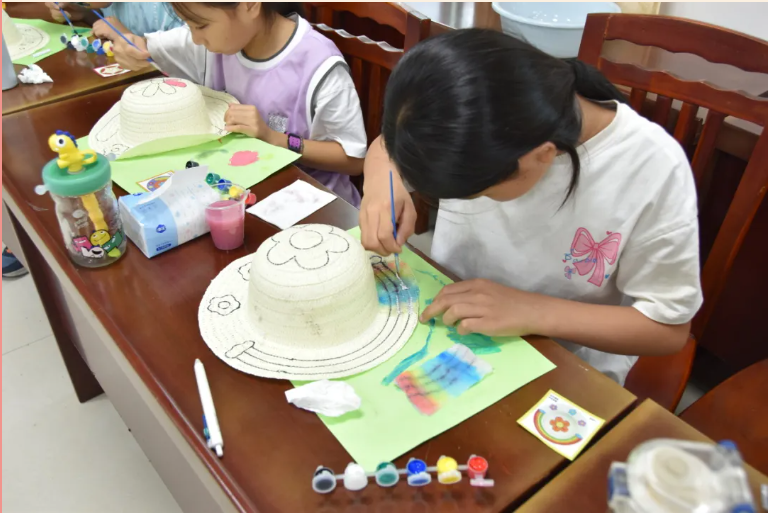 如果说绘画课是想象力的放飞,那么“真心‘画’大‘帽’险”便是创意与生活的相遇。当一顶顶朴素的草帽分发到手中,孩子们先是好奇地抚摸草编的纹路,随即在老师的示范下,用画笔描绘起独特的图案:向日葵沿着帽檐绽放,彩虹从帽顶滑向边缘,连平日里常见的牵牛花、小蝴蝶,也被请上草帽,成了最灵动的装饰。 老师们适时讲解色彩搭配的奥秘,孩子们似懂非懂地点头,却在落笔时自有章法——有的用撞色表现活泼,有的以渐变传递温柔,草帽也渐渐褪去朴素,被孩子们绘成田园风光,鲜花与蝴蝶共舞,每一顶都成了独一无二的“夏日勋章”。