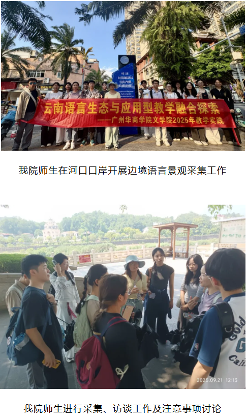 9月21日,团队奔赴中越边境的河口瑶族自治县,开展全天的边境语言景观采集工作。河口口岸作为中国通往东南亚的重要陆路通道,商贸活动频繁,人员往来密集,语言环境复杂多元。师生们以河口口岸附近的三条主要街道(滨河-天香街路、河边街-天香街、龄陵街-天香街)以及口岸周边为核心区域,系统采集了沿街商铺招牌、广告牌、公共指示牌、政府公告等多语标识,并利用拍照、笔记等方式进行了详细记录。 除静态景观采集外,团队还分组对当地部分经商者、务工人员及居民进行了简短访谈,深入了解他们在日常交际、商业活动、跨境往来中的实际语言使用状况、语言态度以及面临的沟通挑战。边境地区特有的语言混用、代码转换现象,以及语言作为经济资本、身份象征的现实功能,为学生们上了生动的一课,也使大家对语言生态的多样性、动态性有了更深切的体会。