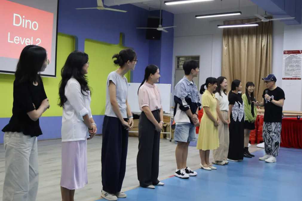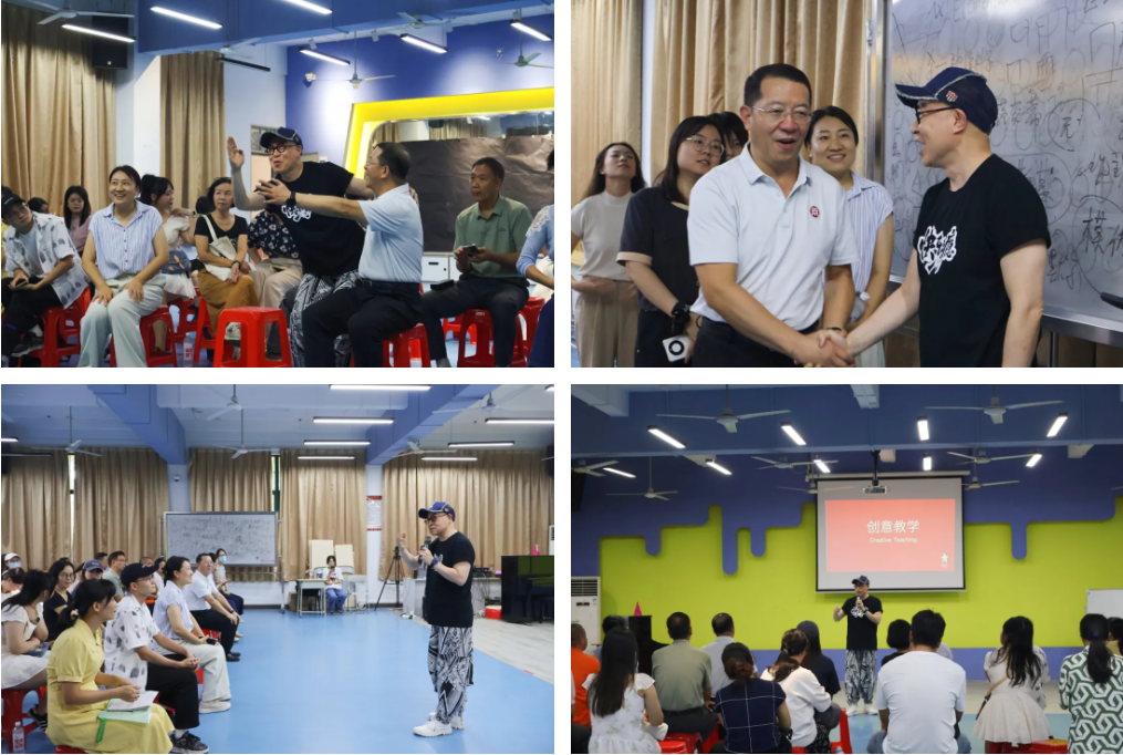 培训伊始,詹瑞文教授以教学实践中的核心问题与老师们展开互动,迅速引发大家的思考与共鸣。紧接着,他带领老师们开展 “鼓掌节奏变化”“跺脚力度控制” 等肢体练习,简单的动作在巧妙引导下,变成了锻炼注意力、想象力与节奏感的 “课堂游戏”。 现场笑声此起彼伏,老师们在轻松的氛围中放下拘谨,亲身体验到 “身体表达” 的魅力,也对 “戏剧与教学融合” 有了直观且生动的初认知。