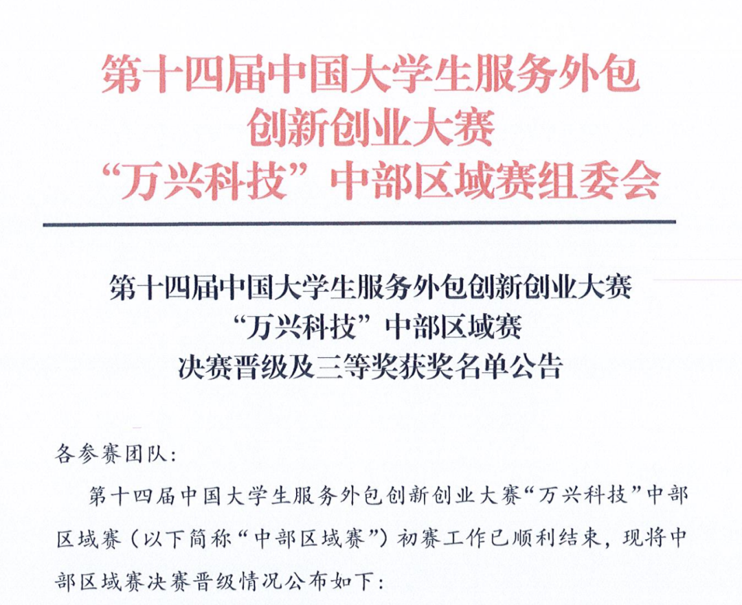 5月16日,中国大学生服务外包创新创业大赛中部区域赛组委会公布了第十四届中国大学生服务外包创新创业大赛“万兴科技”中部区域赛决赛晋级及三等奖获奖名单。