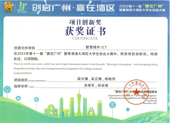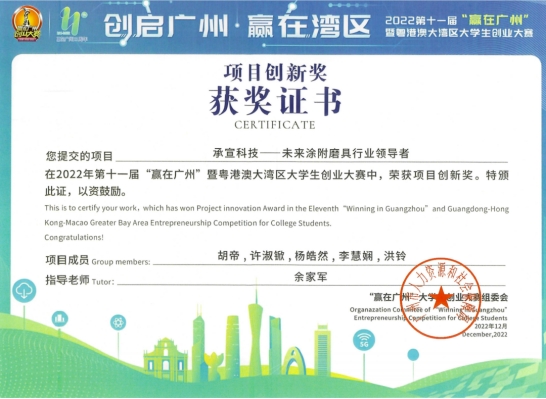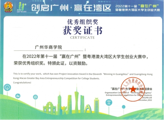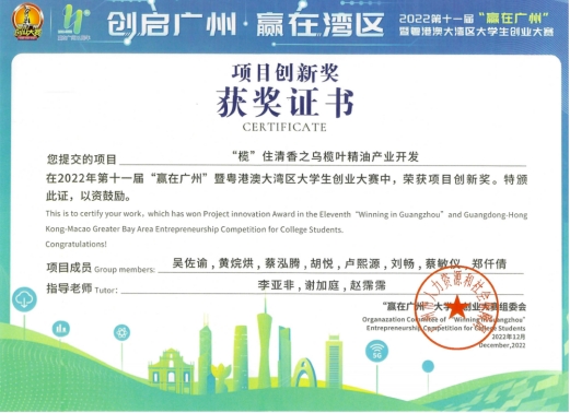 由广州市人力资源和社会保障局主办,中国南方人才市场管理委员会办公室承办的2022年第十一届“赢在广州”暨粤港澳大湾区大学生创业大赛圆满落幕。新伟德国际1946《“榄”住清香之乌榄叶精油产业开发》《稚影传媒——融媒体领域专业服务商》《承宣科技——未来涂附磨具行业领导者》《智慧城市ICT》《藏香阁——中药香水》5个项目均荣获项目创新奖,我们荣获优秀组织奖。