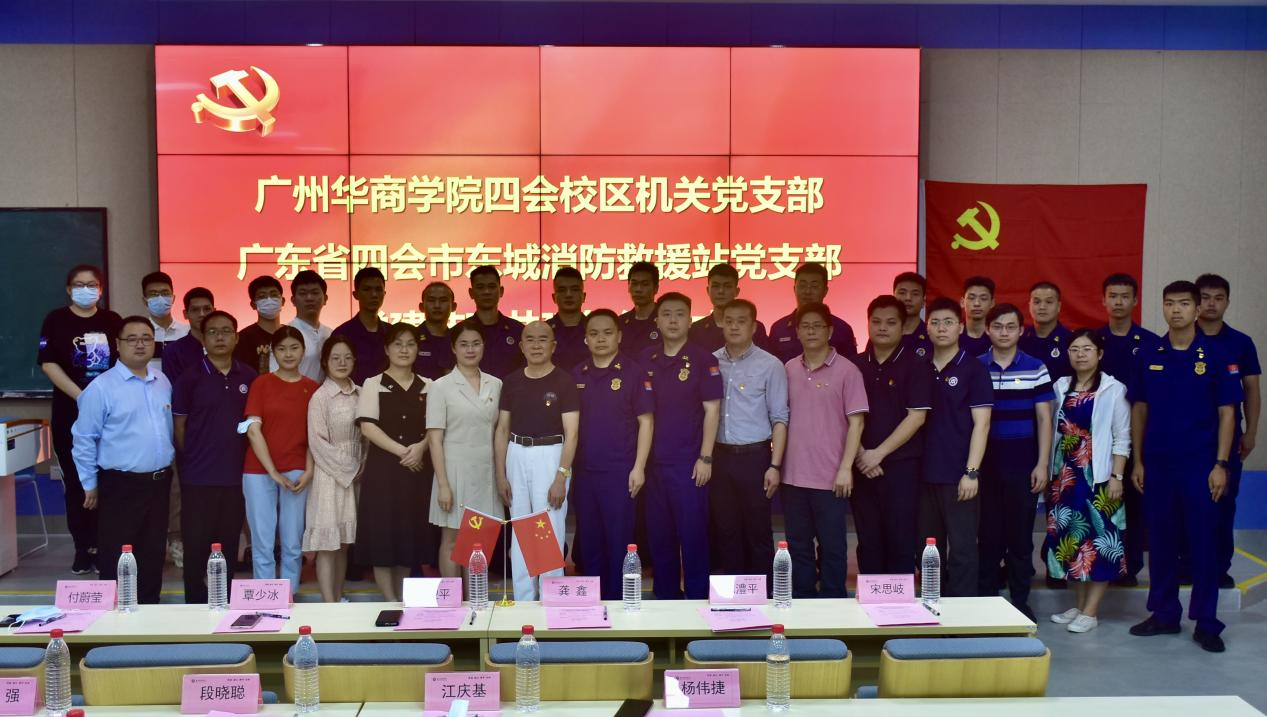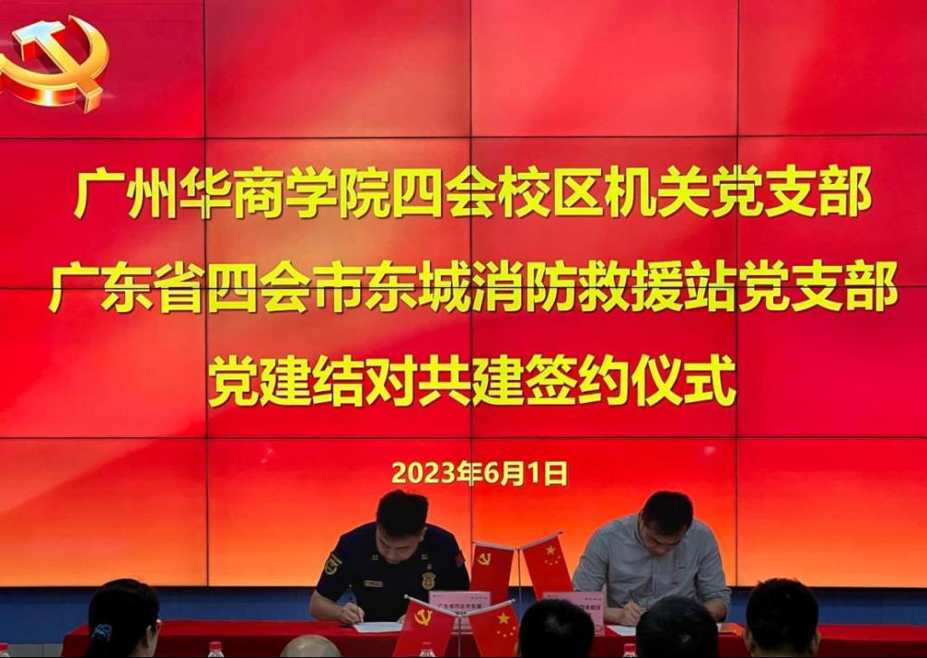 党建共建聚合力,结对互助促发展。为深入推进学习贯彻习近平新时代中国特色社会主义思想主题教育,2023年6月1日下午,在学校党委的指导下,四会校区机关党支部与四会市东城消防救援站党支部举行党建结对共建签约仪式。新伟德国际1946四会校区党委书记王卫平、副书记覃少冰、委员付蔚莹、段晓聪、江庆基,四会市东城消防救援站党支部书记宋思岐、教导员龚鑫、副站长陈澧平等领导出席本次活动,四会校区各党支部书记、支委、各支部党员代表、四会市消防救援大队指战员代表共同参加本次活动。
