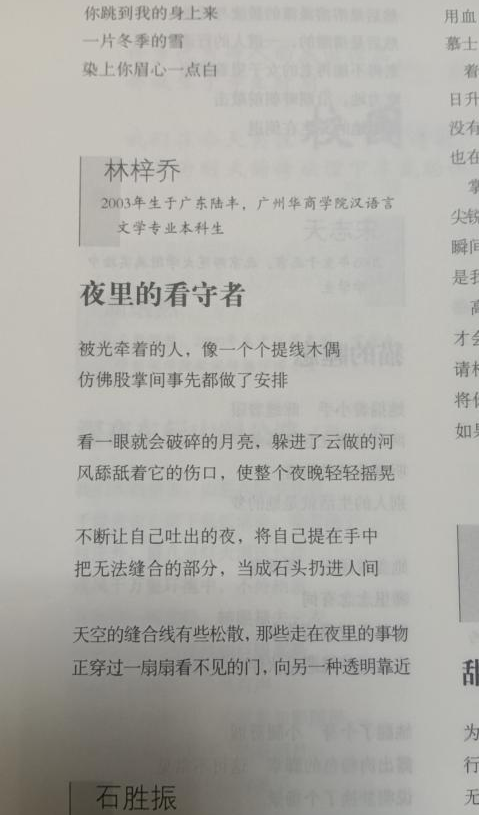 2023年7月,伟的国际1946bv官网汉语言文学专业21级3班学生林梓乔发表诗歌作品《夜里的看守者》于《诗刊》(2023年第14期)。林梓乔同学在国内顶尖的诗歌刊物上发表作品,是我们创意写作教育与诗歌教育的重要收获,体现了学生文学创作水平的进一步提升。