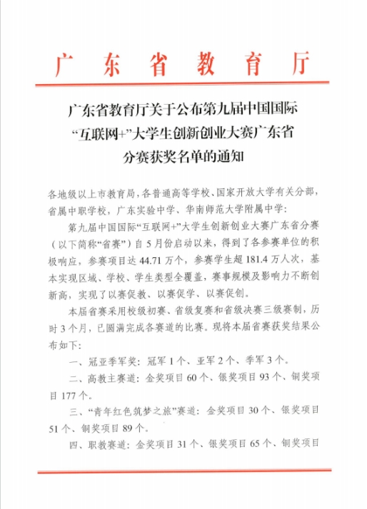 第九届中国国际“互联网+”大学生创新创业大赛广东省分赛(以下简称“省赛”)自5月份启动以来,得到了各参赛单位的积极响应,我们紧密围绕大赛提出的“更中国、更国际、更教育、更全面、更创新、更协同”的要求,认真筹划、积极组织,落实立德树人根本任务,传承和弘扬红色基因,聚焦“五育”融合创新创业教育实践。学校领导、各相关部门、各学院高度重视和大力支持,多次开展相关讲座及辅导培训,激发我们学生的创新创造热情,深度挖掘培育优秀的创新创业项目,不断提升参赛项目的质量和水平。