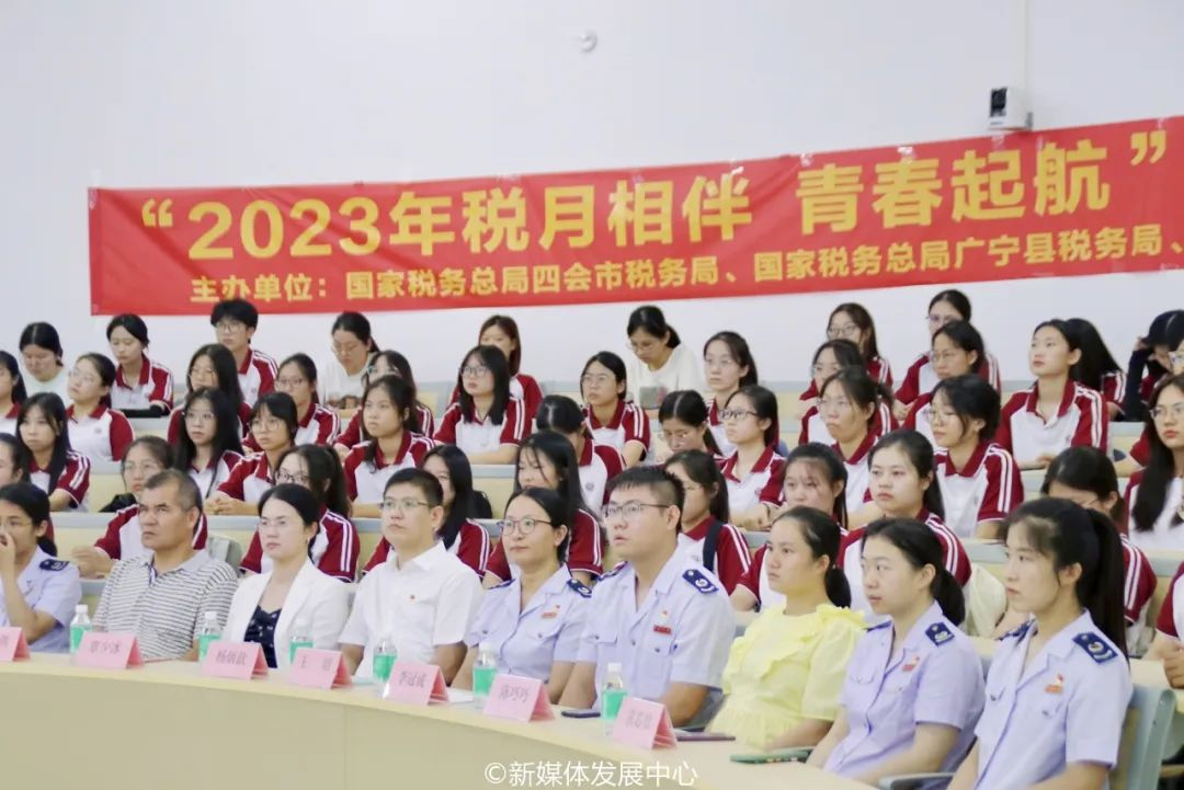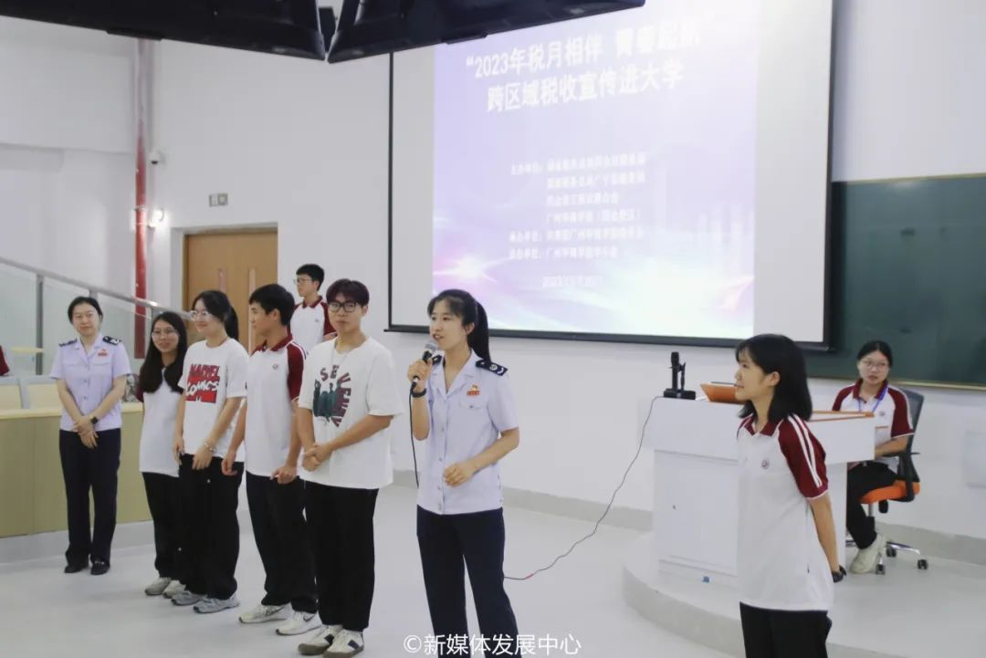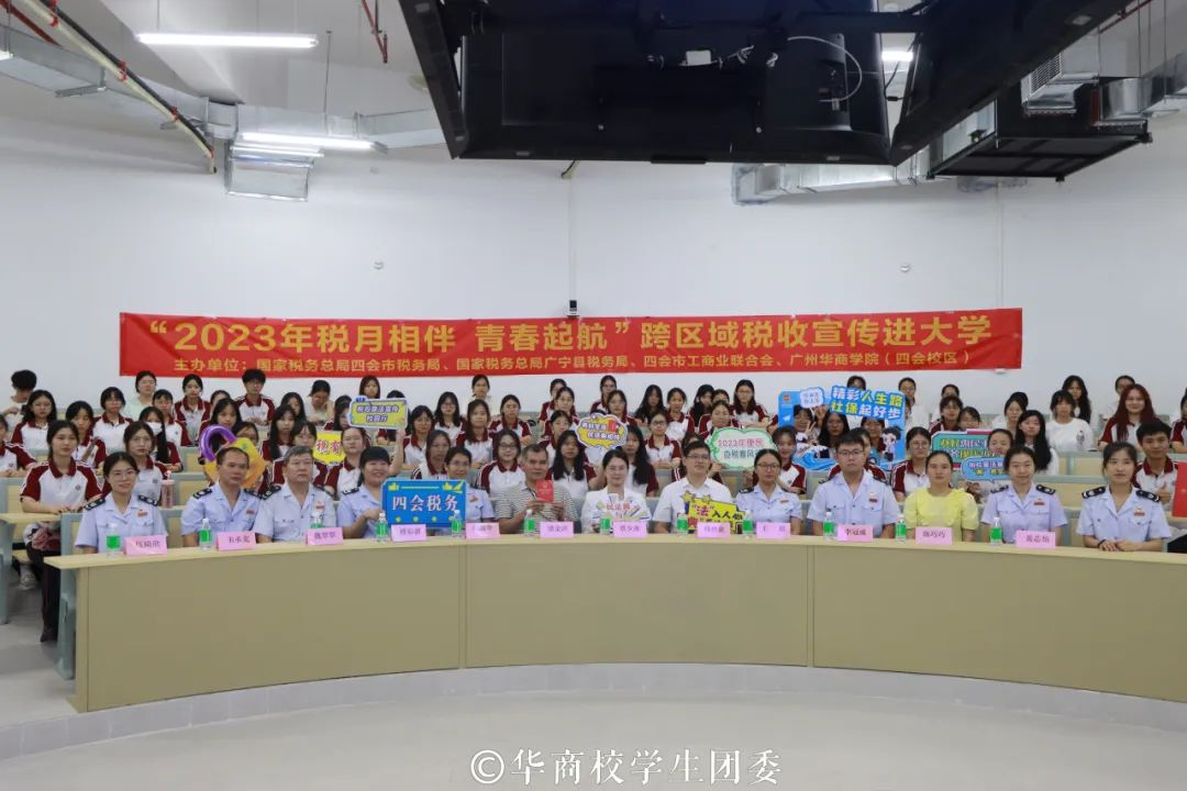 为助力大学生走稳走好创业就业第一步,推进校园税收普法教育和学生税收实践相融合,9月20日,国家税务总局四会市税务局、国家税务总局广宁县税务局、四会市工商业联合会联合我们开展的2023年“税月相伴 青春起航”跨区域税收宣传进大学活动顺利举办。新伟德国际1946校长助理、四会校区党委副书记、管委会常务副主任覃少冰,四会市税务局党委委员、副局长杨炳歆,四会市工商联会员部部长梁金洪,广宁县税务局第一税务分局局长王培以及税务局、工商联、新伟德国际1946(四会校区)相关工作人员参加本次活动。