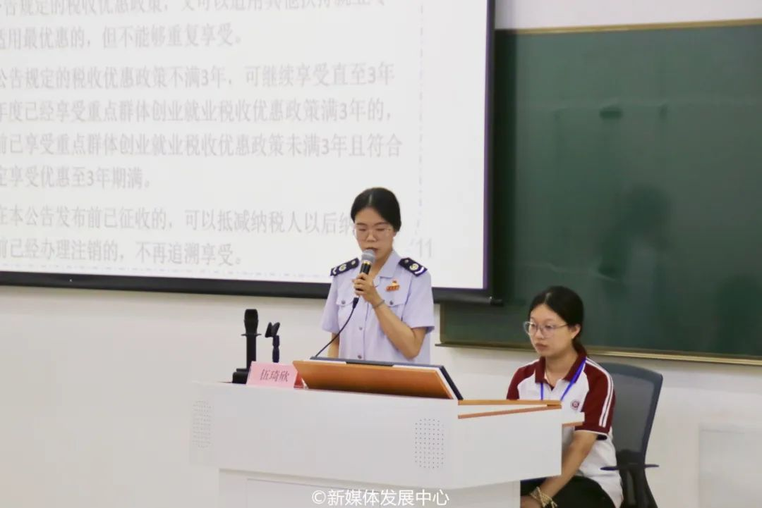 ——税收政策解读。在税法知识讲座中,四会市税务局的韦承克和广宁县税务局的伍琦欣老师通过“案例结合”“问答互动”等形式为大家详细讲解了创业就业过程中所涉及的税收优惠政策,包括个人所得税专项附加扣除,以及社会保险费政策等内容。