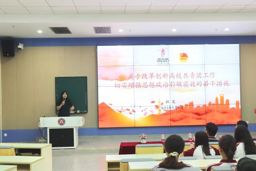 为认真学习习近平总书记在同团中央新一届领导班子集体谈话时的重要讲话精神,加强青年学生的思想教育,厚植爱党、爱国、爱社会主义的情感。9月,管理学院团委面向双校区青年团员开展“学习习近平总书记同团中央新一届领导班子成员集体谈话时的重要讲话精神”主题团课。团委书记徐煜忻号召管理学院的团员青年要在日常生活中刻苦学习、积极进取,坚定理想信念、培育高尚品格、练就过硬本领、勇于创新创造、矢志艰苦奋斗,毫不动摇地听党话、跟党走。罗玉凤副书记强调,同学们要认真深刻领会其中的丰富内涵和精神实质,旗帜鲜明讲政治,不断提高政治判断力、政治领悟力、政治执行力,以青春奋斗姿态挺膺担当。学院团委副书记魏巍指出,在全面贯彻落实党的二十大精神开局之年,习近平总书记对共青团工作发表重要讲话,有重大深远的战略考量,同学们要始终走在坚定拥护“两个确立”、坚决做到“两个维护”的前列,立志做有理想、敢担当、能吃苦、肯奋斗的新时代好青年。