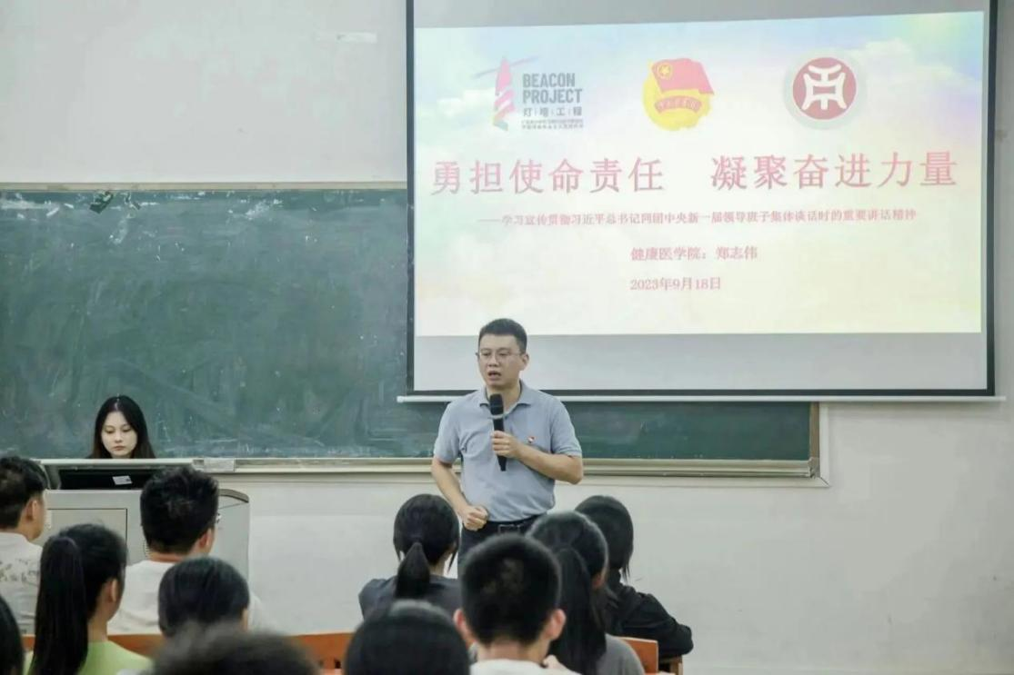 为更好地学习宣传贯彻习近平总书记的重要讲话精神,新伟德国际1946健康医学院于2023年9月18日下午3:00在励志楼C101开展了主题为“勇担使命责任,凝聚奋进力量”主题团课。健康医学院各学生组织骨干、各班学生代表参与本次会议。郑志伟老师带领同学们细致解读了习近平总书记的重要讲话内容,一览共青团和青年工作的变革历程,深度剖析党中央对共青团工作的新要求,并针对培养什么样的青年、建设什么样的共青团两个问题做出基本概要。郑志伟老师对同学们提出三点嘱托与期望:第一,团结奋进,踔厉向前争做先锋;第二,实干担当,脚踏实地服务为民;第三,钻研学业,精益求精奉献社会。他希望各学生组织骨干、各班学生代表能够将所学习的内容付诸于实践,以实际行动担当青年责任,以刻苦努力建设国家。
