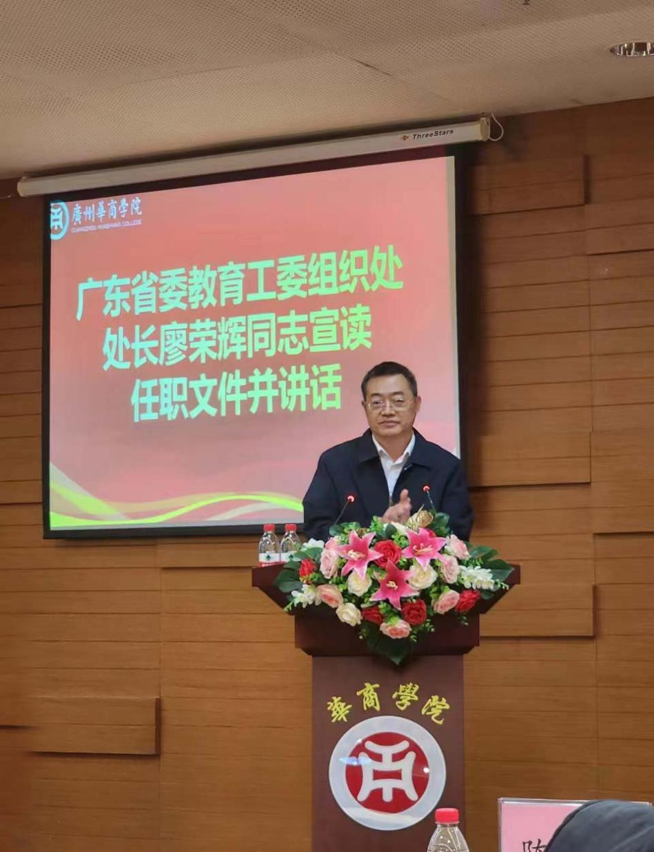 省委教育工委组织处廖荣辉处长宣读任职文件并讲话。廖处长宣布,经中共广东省委教育工作委员会、广东省教育厅研究决定,陈玉欢同志任新伟德国际1946党委书记兼督导专员。