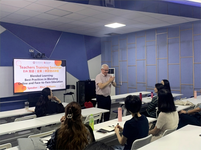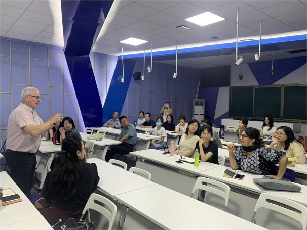 24日,Rhys先生在华商校园分别为学生和双语(全英)教师举办讲座。他以“如何在国际工作环境中取得成功”为主题为我们学生做讲座,以“混合在线和面对面教育的最佳实践”为我们全英(双语)师资做培训讲座。两场讲座由王文忠处长主持。