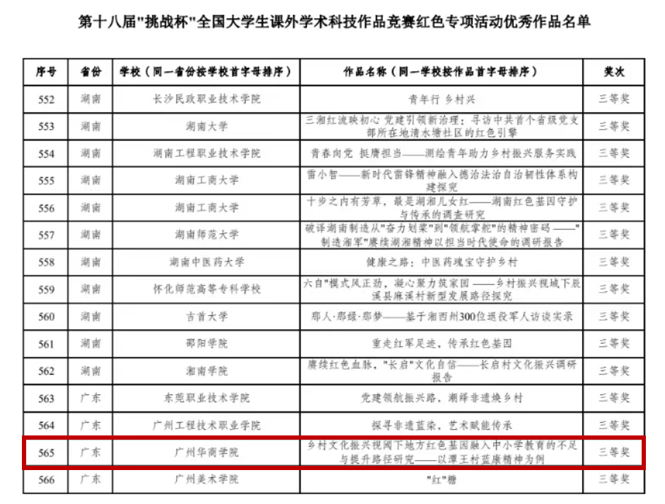 我们2023年暑期三下乡社会实践团队“青衿萤火”作品《乡村文化振兴阈下地方红色基因融入中小学教育的不足与提升路径研究——以潭王村蓝康精神为例》荣获第十八届“挑战杯”全国大学生课外学术科技作品竞赛红色专项活动三等奖。