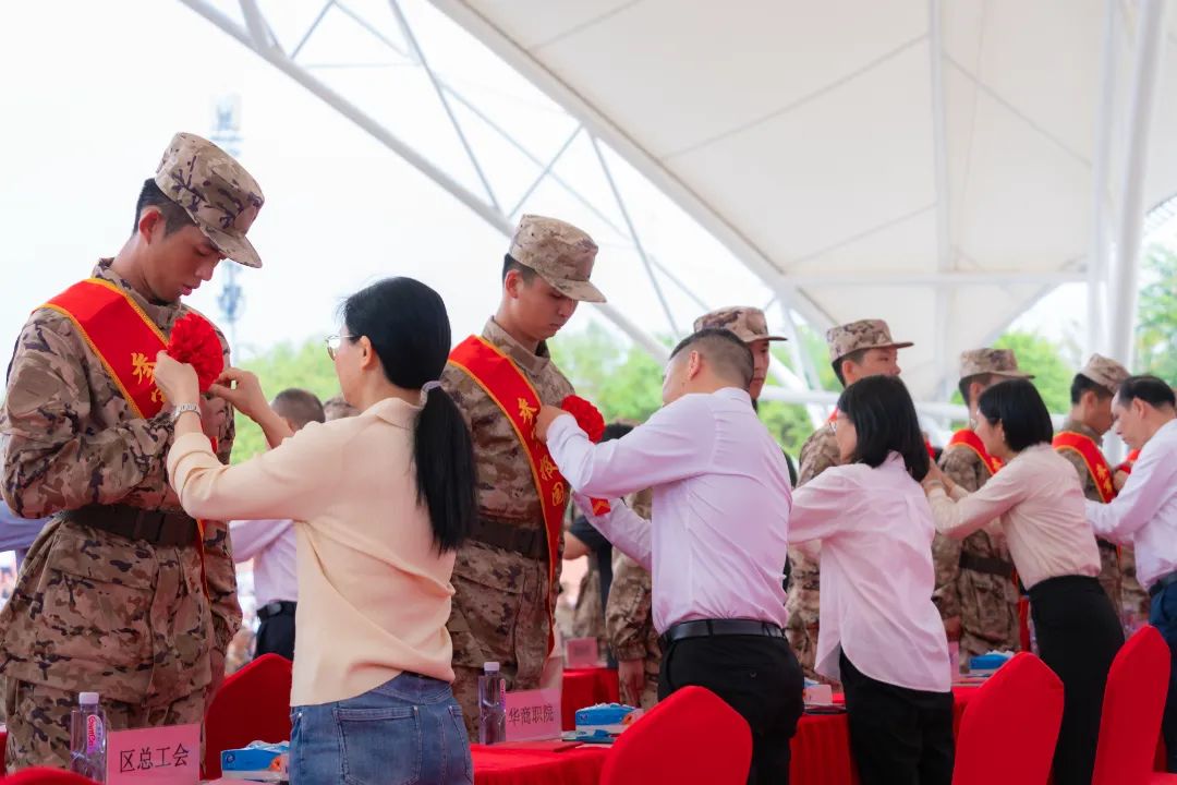 欢送大会在庄严的国歌声中拉开帷幕。增城区领导宣读了《新兵入伍命令》,并为新兵代表佩戴大红花、颁发《入伍通知书》。我们新兵下定投身军营、报效祖国的决心,展现华商学子昂扬向上的精神风貌。