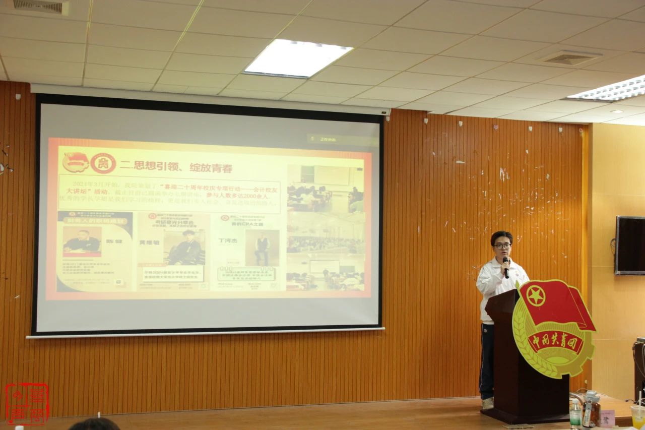 会计学院团委等13个二级学院基层团组织代表依次进行汇报,各二级学院团委骨干代表详细展示了所在团组织在思想引领、组织建设、文化建设、志愿服务和社会实践等方面的成绩。他们始终坚持党建带团建,推动党团工作深度融合,夯实基层组织根基,深化青年思想引领,增强组织凝聚力,充分发挥团组织在团结青年、教育青年、服务青年中的核心作用。