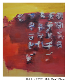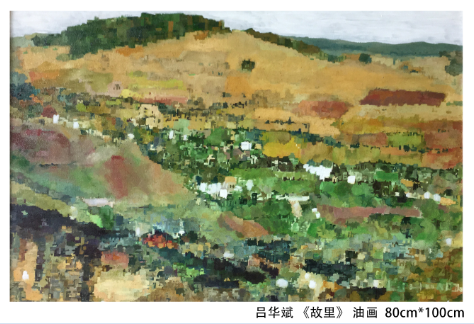 艺术系主任乌日图提出“投入自然怀抱,创造美好图画”的创作理念,其创作热情在自然风景写生过程中得以激发。他的作品以自然物象作为主题引导,为大家呈现出远山苍翠、绿原无垠、碧空如洗、纤云如烟、生机盎然的自然美景。同样以自然风景作为描绘对象,绘画基础教研室主任吕华斌的作品更侧重于主观情感的表达。在题为《故里》的作品中,静谧的田园风光隐喻着作者理想中的家园,表现出人们对逝去的美好生活追忆和人与自然和谐共处的牧歌式生活的向往。通过视觉强化与心理暗示的手法来表现“物·悟”的主题,是黄功翔老师作品《红黄蓝》的特色。他用色彩的对比来强化生活中常见的浴缸这一物象,唤醒我们对洗浴行为的记忆,暗示沐浴不仅能洗去身体与心灵的污垢,还能涤除人们的主观欲念、成见。浴缸藏污纳秽,却又涤除玄鉴,引诱观者对圣洁进行思考。李森老师的系列作品通过瞬间凝固的影像画面表现主题,“惚兮恍兮,其中有象;恍兮惚兮,其中有物”,模糊不清的画面勾起观者对真实、虚无、瞬间、永恒、怀念、遗逝乃至生命意义的思索。在张会锋老师的作品中,我们看到了他对传统文化的关注。他把汉民族的古文字作为“物·悟”的切入点,以“图画”代替“书写”,用西方技法展现中国传统文化,通过古今中外文化的对话与交流,进而思考文化的承继与弘扬问题。侯兆丰老师擅用抽象的几何符号来呈现多义的内涵。《破碎的记忆》系列表现的是对混乱记忆的映像,残缺的圆、黑色的十字、白色的三角等符号这些元素在他的画面中突兀而又谐和,这些个性化的符号具有超现实的象征意义。盛一生老师以独特的视角探索人的精神世界,带有内心自省的意味,他的作品极具内在的张力,对抗、冲突跃然纸上。他的肖像画系列更是如此:粗狂的线条,压抑的躁动,撼动着观者的眼和心,唤起观者对心灵迷失问题的关注,进而沉思、反省。